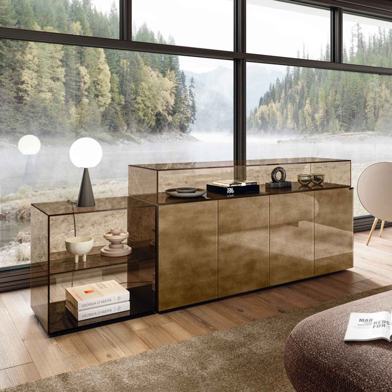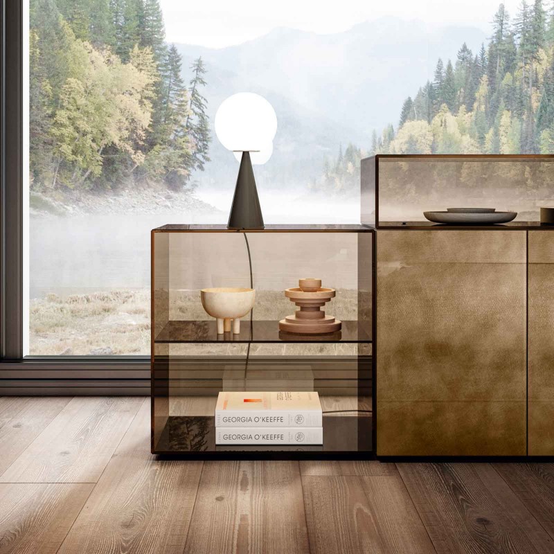 Lago reinterprets a cult from its collection: 36e8, the versatile system of containers with decisive volumes with the elegant 45-degree working and alternations in glass, now also in the smoked gray or bronze finish. Sophisticated sideboards with a contemporary design, which are revealed in a play of full and empty spaces enhanced by finishes such as glossy or opaque glass, marble or wood effects with XGlass or Wildwood wood.