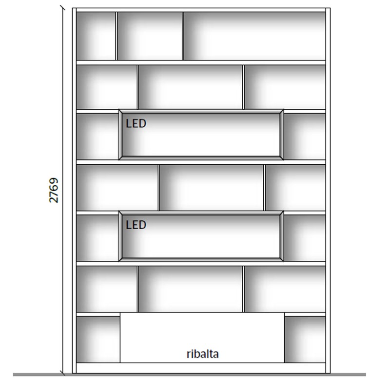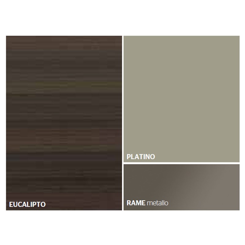 In this fixed composition, 505 is a bookcase proposed with flap. Structure, display and flap in eucalyptus. Platinum matt lacquered back panels. Dividing sides in copper finish metal. LED lighting.