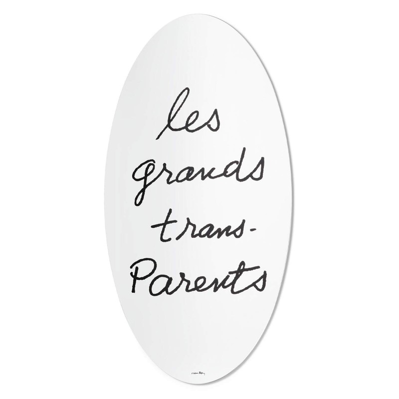 An undisputed icon of the Cassina catalog, Les Grands Trans-Parents is the perfect fusion of art and everyday objects. The mirror, with its original wordplay screen-printed on the glass, is inspired by a work by Man Ray, a painter and photographer who was one of the most radical exponents of Dadaism and Surrealism. Ray loved to experiment and achieved innovative results with airbrushing and photographic film. The elliptical mirror has a rigid polyurethane base and the inscription has been mass-produced since 1971 as part of Simon's Ultramobile collection and is now part of the Cassina SimonCollezione collection. Les Grandsy Trans-Parents adds that artsy touch that makes rooms sophisticated.