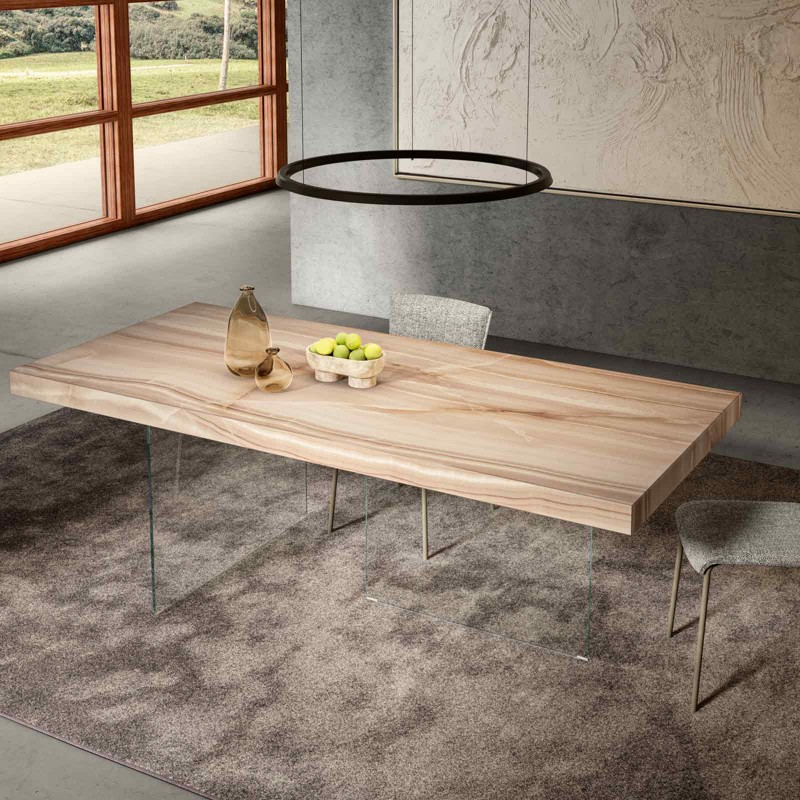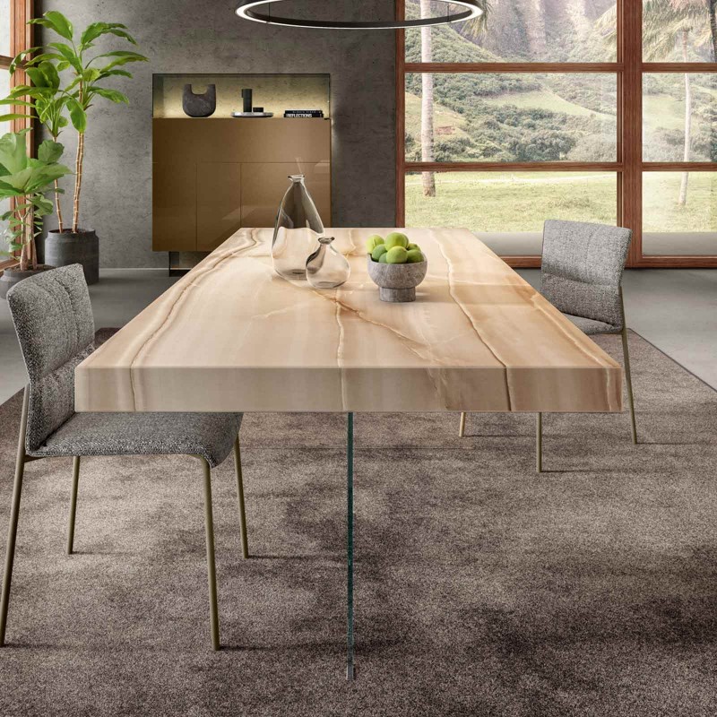 The iconic Air table by Lago, emblem of lightness, is renewed for the 2022 collection in a new sophisticated XGlass Onice finish. Entirely covered with glass, the top has a thickness of 8 cm. Available in a glossy or matte finish, Lago continues its aesthetic research on surfaces, declining it on iconic products such as the Air Wildwood table, in which the solidity of the wood contrasts with the lightness of the glass legs.
