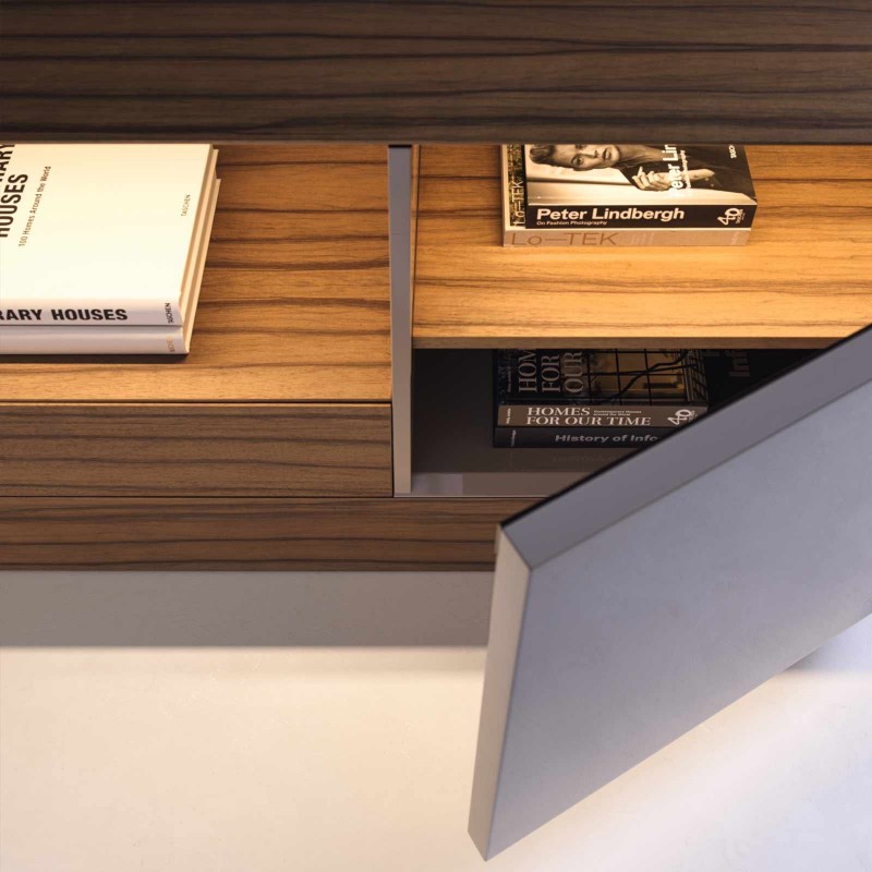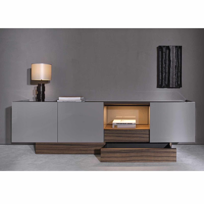 Archway is the 2023 sideboard by Molteni&C design Rodolfo Dordoni. The perfect blend of aesthetics, compositional concept and mix of materials, Archway stands out for the use of different surfaces and for a minimal and elegant design, thanks to the clean lines and the play of the various thicknesses. The door is enhanced by a slightly cantilevered metal profile with respect to the top, to determine the handle. The grooves of the doors are cut at a 45 degree angle, helping to embellish the furniture in detail. The 18 cm base conceals a drawer inside.
