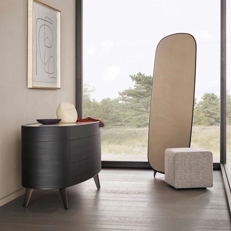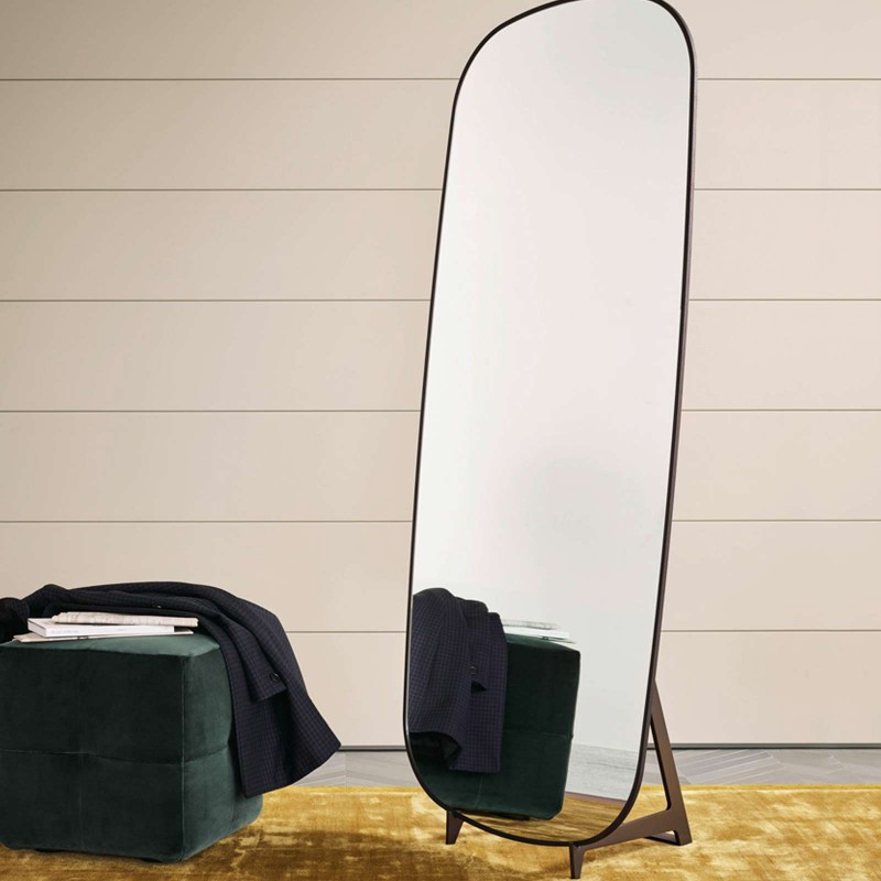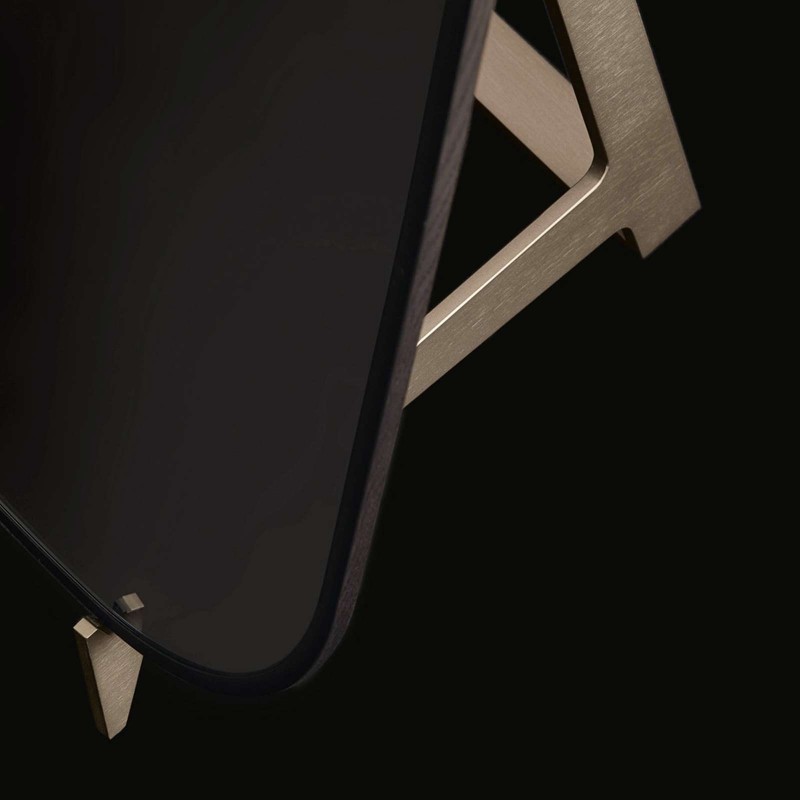 Audrey by Poliform is the floor mirror with easel with rounded corners, perfect for giving a decorative touch to the bedroom. The black elm wood frame is thin, while the mirror is available in a clear or bronzed glass finish. The base is available in champagne or brown nickel satin metal. Audrey by Poliform is also proposed in the wall version.