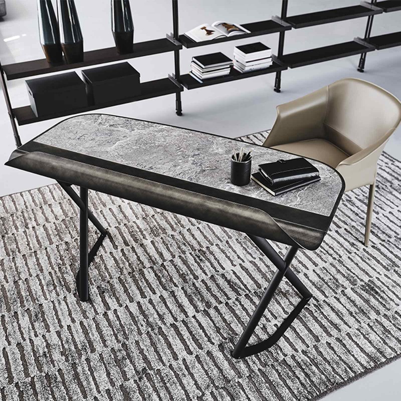 The Cocoon Keramik desk by Cattelan Italia is a piece of furniture designed to create a home office corner within domestic spaces. Cocoon combines the comfort of a workplace with the reassuring aesthetics of a residential environment. Proposed with the ceramic top available in 12 marble effect colors, Cocoon can also be a console to be inserted at the entrance. The embossed painted steel base can be titanium, black or bronze. The lower rounded profile and varnished object-holder groove in a varnished metal can be Brushed Bronze or Brushed Gray.
