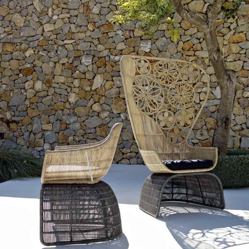 Crinoline by B&B Italia Outdoor is the collection of seats with a feminine twist that recalls the embroidered skirts of nineteenth-century ladies. A project conceived by Patricia Urquiola, Crinoline is characterized by a high, curved backrest and enveloping seat. In this two-tone abaca version, Crinoline is made special by the interwoven floral motif.