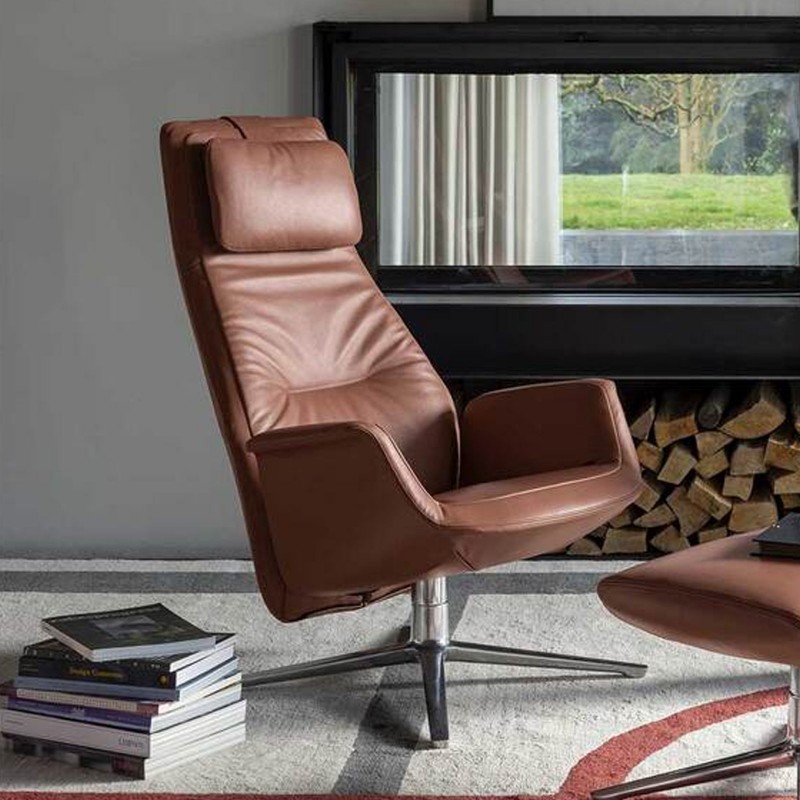 Downtown Lounge is the relaxation-oriented declination of the Downtown office chair designed by Jean-Marie Massaud for Poltrona Frau. Among the 2025 novelties, the armchair originally conceived for workspaces lands in the residential world with revised ergonomics: the backrest is slightly inclined to encourage natural and comfortable posture by providing full support up to the head. Downtown Lounge is appreciated not only because it is an invitation to relax, but also for its refined aesthetics. In this version it is offered with a 4-spoke metal swivel base.