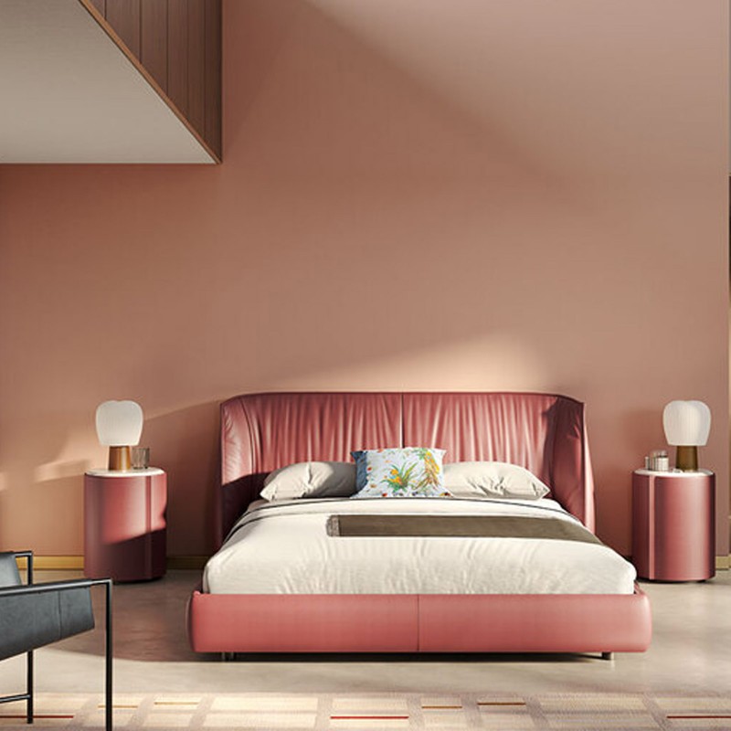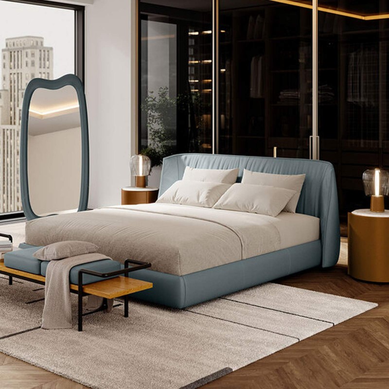 The Archibald collection designed by Jean-Marie Massaud for Poltrona Frau, which includes chairs, armchairs, and stools, also extends to the bedroom with a bed that perfectly matches the iconic Archibald style. The Archibald bed embodies the refined and welcoming essence of the series. The design features a bed frame and wraparound headboard. The aluminum feet are cylindrical, black in color, and available in two heights: 14 cm and 17 cm. The Poltrona Frau logo is hot-stamped in the center of the back. The headboard is shown here in leather but is also available in fabric. The Archibald bed is also available for mattresses with a depth of 210 cm.