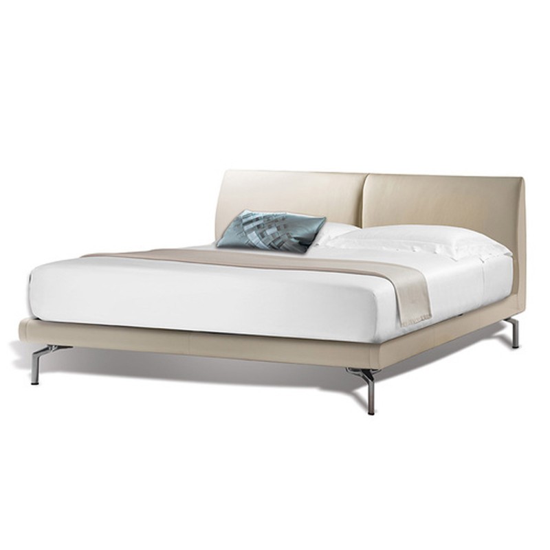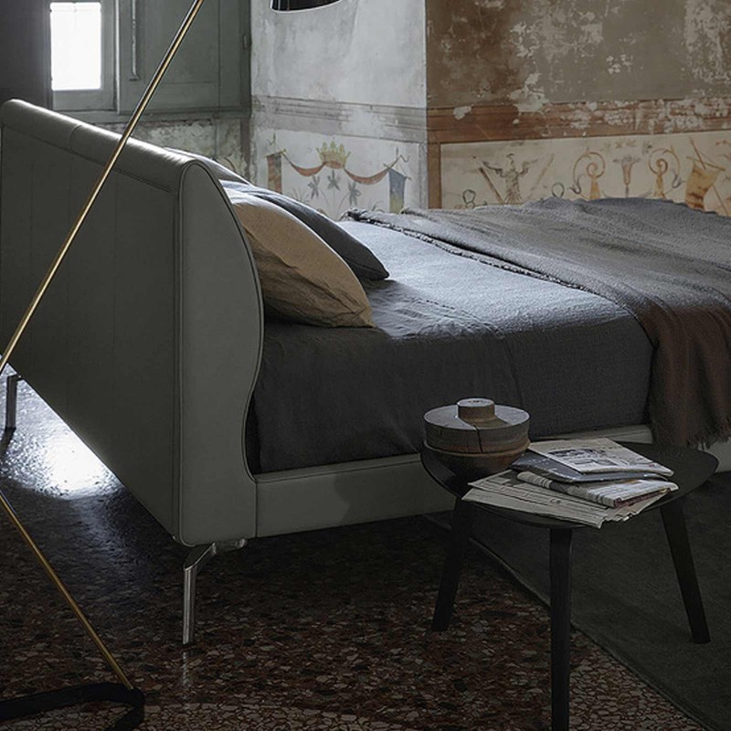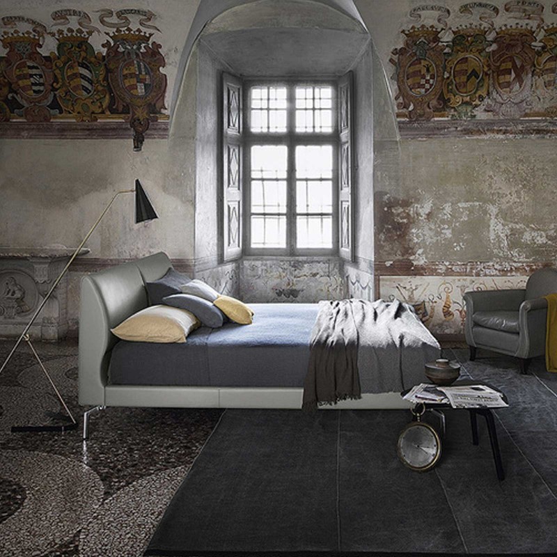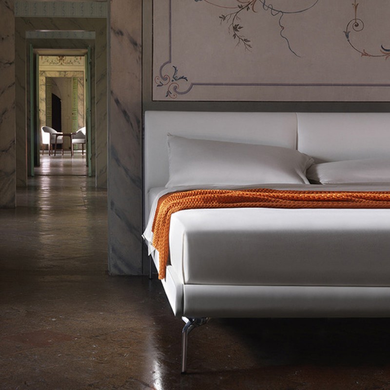 Eosonno is a bed with soft, contemporary lines designed by Luciano Pagani and Angelo Perversi for Poltrona Frau in 2001. The bed stands out for its slightly curved headboard and accommodates mattresses measuring 200 and 210 cm in length. The base consists of four simple aluminum feet, also available in a cylindrical shape covered in leather.