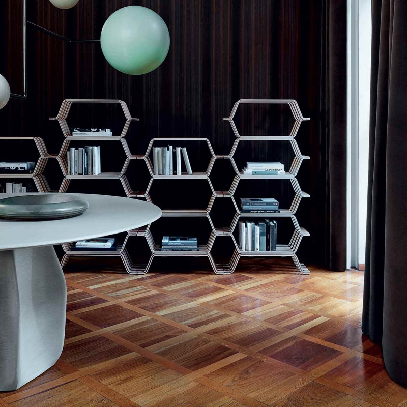 The MHC.2 bookcase by Molteni & C is a re-edition of the prototype of the bookcase designed in 1959 by Yasuhiko Itoh. With hexagonal modules, it is made of curved wood, complex processing for the time, MHC.2 was awarded at the 3rd edition of the Selective of Cantù in 1959. The result is an elegant and refined piece. After a first limited re-edition of 100 numbered pieces, it is now available in an unnumbered series in curved wood covered in walnut.
