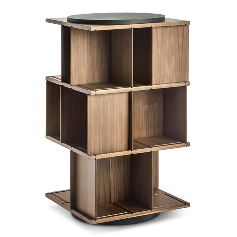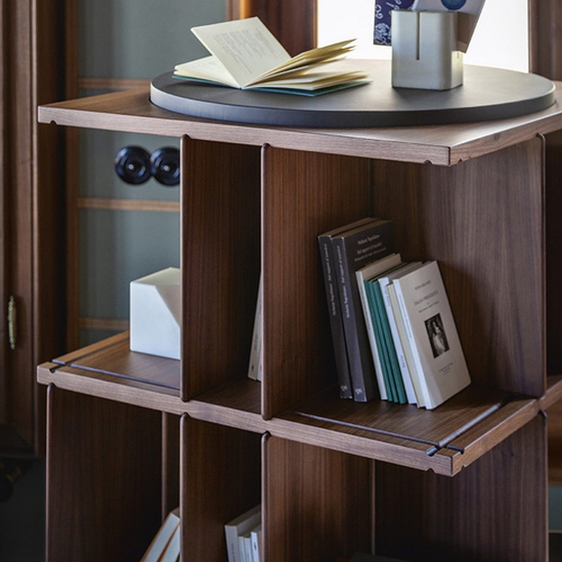 Turner is Poltrona Frau's bookcase designed by Gianfranco Frattini in 1963 com e reissue of his historic Model 823 swivel bookcase. An original and innovative design that takes its cue from the classic English bookcases for the center of the room, dedicated to the selection of the “books of the heart” to keep always at hand. Turner has an avant-garde soul that still makes it an undisputed icon of design and a model from a constructive point of view: the load-bearing structure develops vertically like a building, in which each floor has grooves that act as rails and allow a series of dividing panels to be removed or inserted, opening up the possibility for compositional freedom. An interplay of solids and voids, where the materials are appreciated: canaletto walnut and Pelle Frau® for the base and top upholstery.