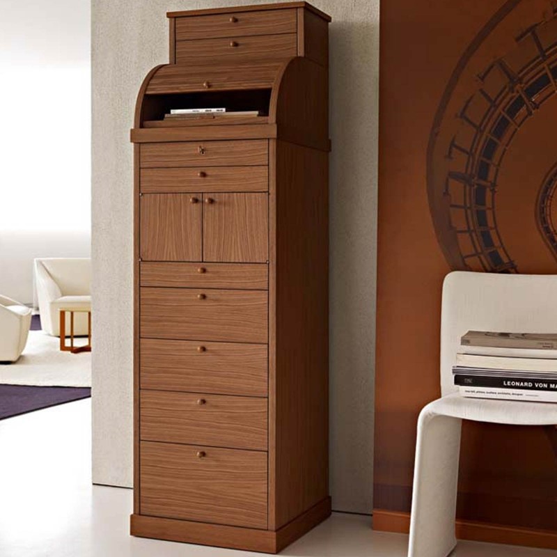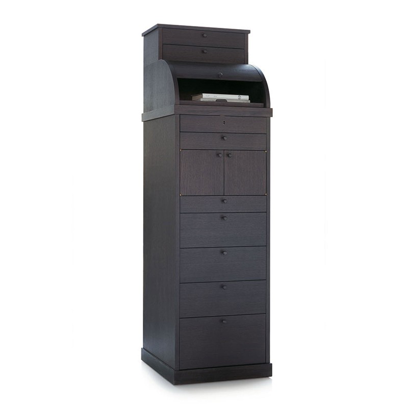 Carteggio secretaire designed by Aldo Rossi for Molteni&c is a piece of furniture from the past, available in eucalyptus or Canaletto walnut essence, with drawers and a closable shelf with a sliding shutter. A traditional, timeless piece of furniture that can interact perfectly with modern furnishings.