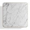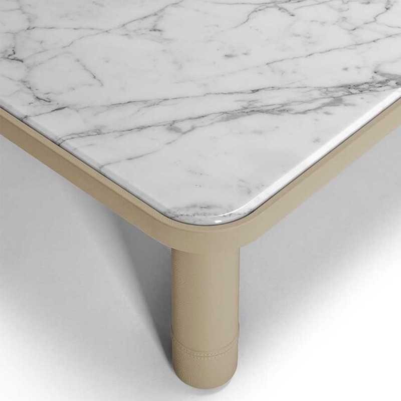 The marble top is recessed with a slight protrusion from the frame, while the glass top is flush with the frame. The Poltrona Frau logo is hot-stamped on one of the four legs.