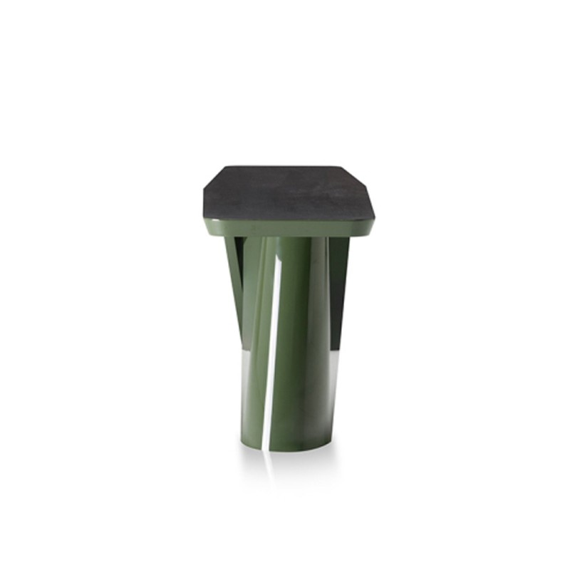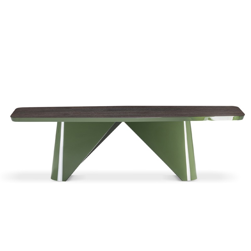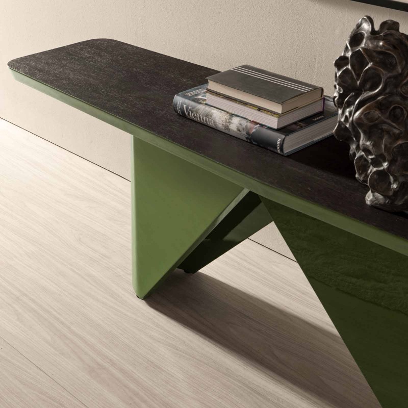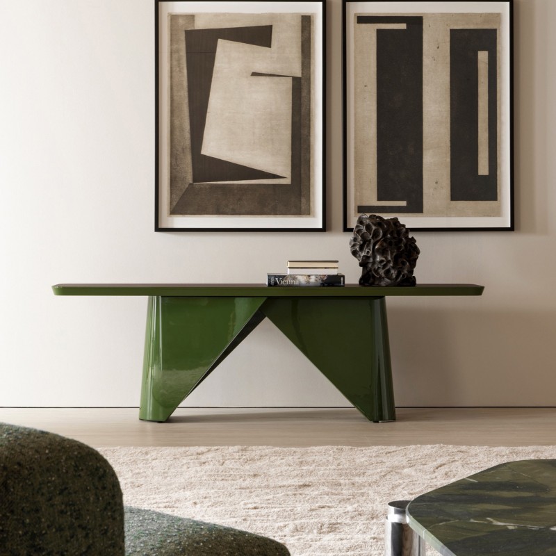 Pénélope is the new console table by Molteni&C presented at Milan Design Week 2025 designed by Christophe Delcourt. An elegant and sculptural complement with immediate scenographic force thanks to a base characterized by two opposite oblique elements that rejoin at the center overlapping and giving a harmonious intersection. The top is available in marble and a polished steel edge or in wood with a glossy lacquered edge for the top: a mix of finishes that enhance the fluid forms of a console table that finds its perfect space either placed next to a wall or positioned in the center of a room. The edge finish is taken up in the base, creating a textural continuity. Pénélope by Molteni&C stands out for its understated yet bold côté.