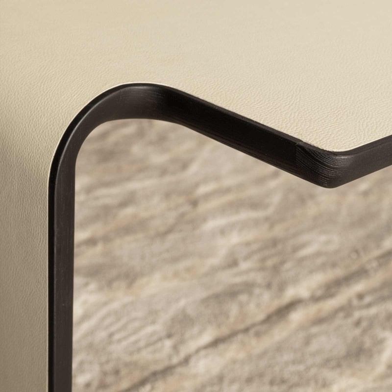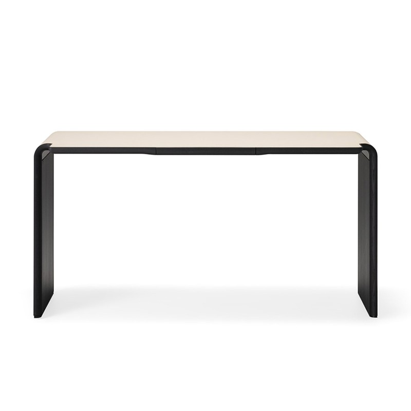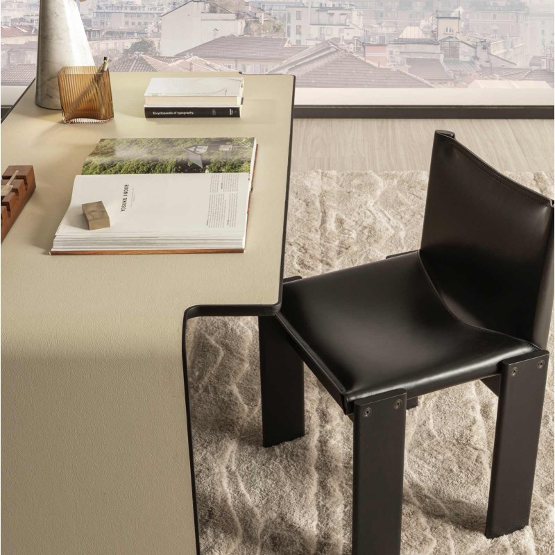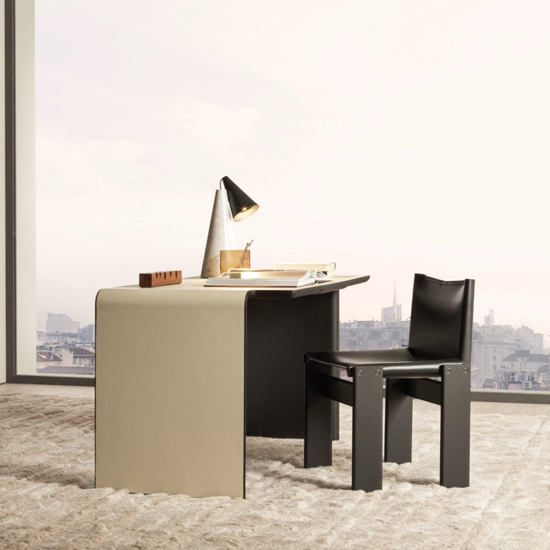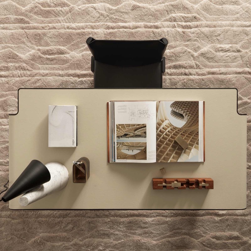 Aria is the new 2025 desk by Molteni&C designed by Vincent Van Duysen that combines lightness and solidity. A functional piece of furniture with a timeless allure, Aria houses several details that combine to make it a contemporary piece with a technical flair. Credit to the painted steel frame, as slender as it is strong, which is reflected in the folded sheet metal covered with a top made of Ecoskin, a vegan leather available in in ivory or dark brown, which is seamless but secured by an innovative magnetic system that contributes to the formal cleanliness of the Aria desk.