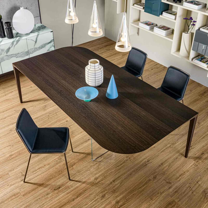 In the sign of material continuity and suspension: the PJ table by Lago enriches the range of tables of the Made in Italy brand designed by Daniele Lago with a unique and original aesthetic. The thin top is characterized by the rounded edges and creates a whole with the wooden legs placed at the opposite ends of the top. The result is a continuous line that hides the high cabinet-making of the structure and the presence of two glass supports underneath which, placed under the center of the top, guarantee solidity and resistance. Available in various sizes, the PJ table is proposed in various wood finishes.