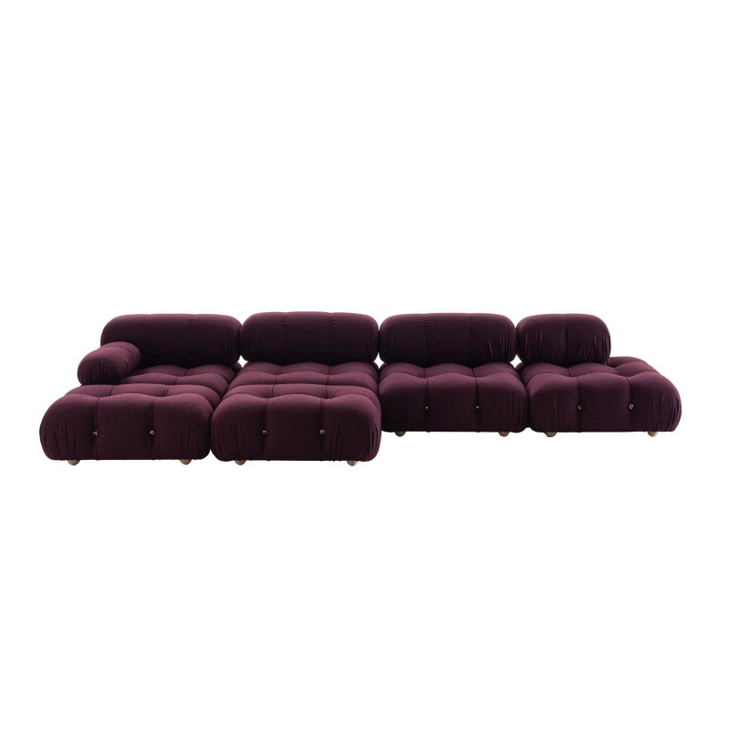 The 2020 reissue of B&B Italia's Camaleonda system includes no structural changes but only a sustainable “upgrade”: the system of cables, hooks and rings and the same padding made of polyurethane with varying levels of density and firmness for greater comfort remain preserved. The synthetic fabric covering the padding is Dacron, removable made from recycled PET. The seat, back, armrests and bases are made of wood panels, resting on spherical feet made of Forest Stewardship Council (FSC)-certified beech wood. Camaleonda's “sandwich” structure uses recycled or recyclable materials that can be easily disassembled.