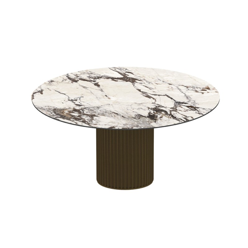 Prominent among Riflessi's 2024 novelties is the Onda table, offered here in a round version, distinguished by a sculptural base whose metal surface has a vertical 3d decoration that makes it even more precious, matching the top, available in two sizes, in ceramic.