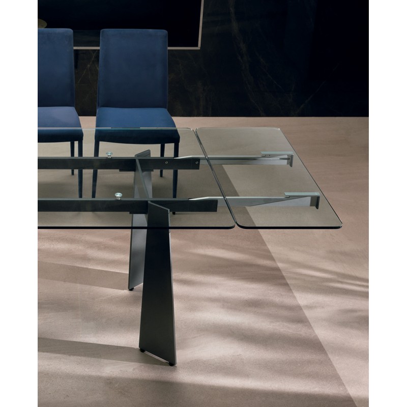 Treble is the table with a rational aesthetic that contrasts the solidity of the aluminum legs with the lightness of the glass top or the refinement of the ceramic top. Treble's originality lies precisely in the base, which undermines the canons of the classic four-legged table with only three supports.