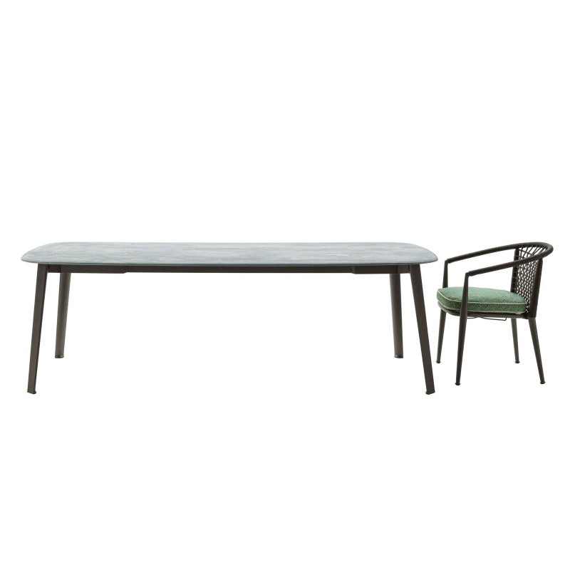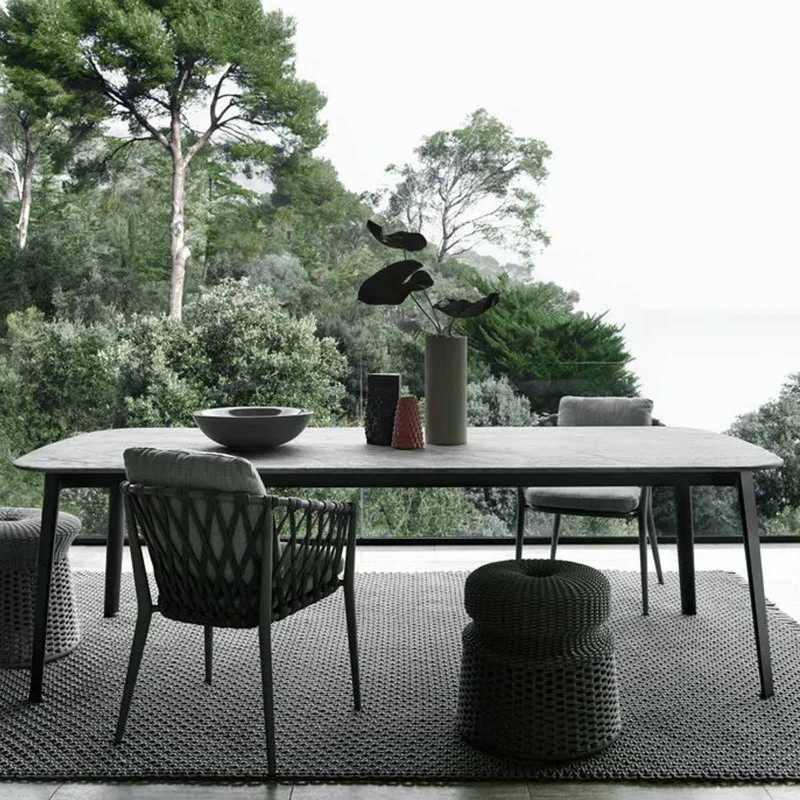 Material and resistant: the Ginepro table by B&B Italia Outdoor is made with a painted aluminum structure and a Serpentine stone top, known for its technical performance. Ginepro is proposed in a rectangular shape with rounded or rounded corners. Ginepro is perfect for outdoor areas and urban terraces.