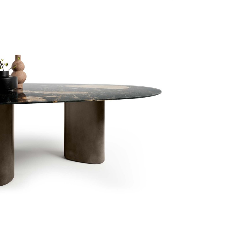 Hoa is the new Lago table with an organic design. Free from rigorous aesthetics, Hoa is available in two shapes: shaped and drop-shaped; while the legs, in peltro steel finish, always characterized by gentle features, are arranged differently depending on the size, in an effort to seek out harmonious shapes. The top can be customized in the glossy or matt lacquered colors of the Lago range, XGlass finishes such as the new Geode here proposed.