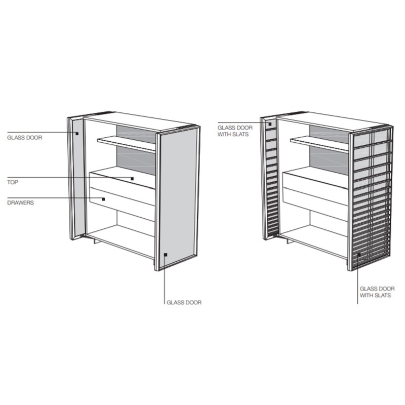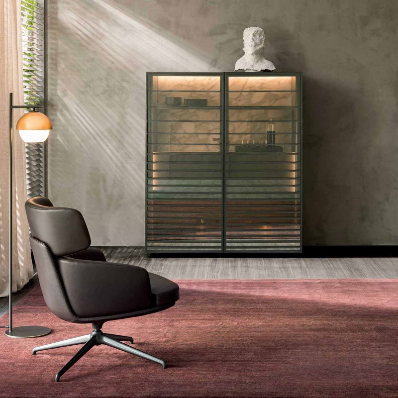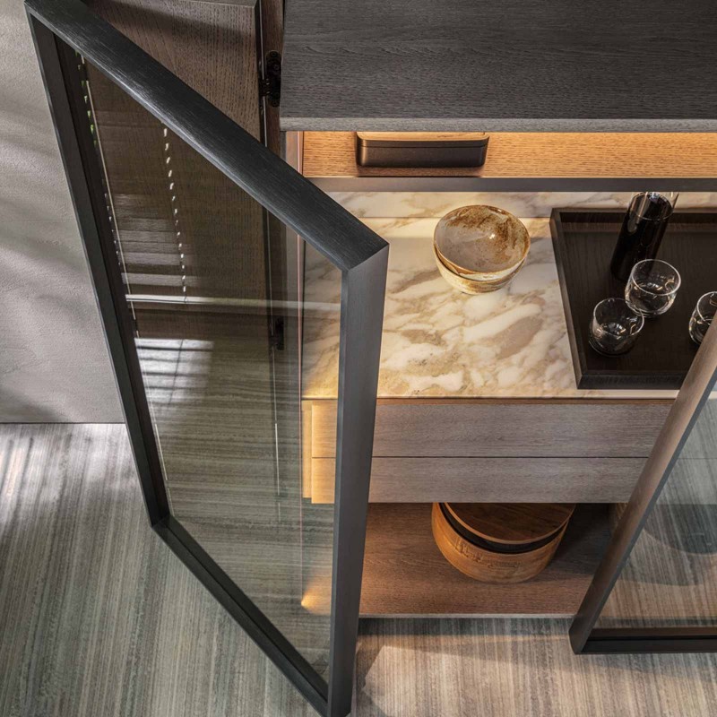 Craftsmanship, technology and aesthetics come together in Horizons, the sideboard by Molteni & C for the living area designed by Dante Bonuccelli. A storage unit that solves the need for storage and display: Horizons is composed of two tilting doors that when closed show a preview of the objects stored inside thanks to the transparent stopsol glass and LED lighting; while once opened they fold up and flank the side structure. Horizons is a decidedly chameleonic piece of furniture enhanced by the noble materials used.