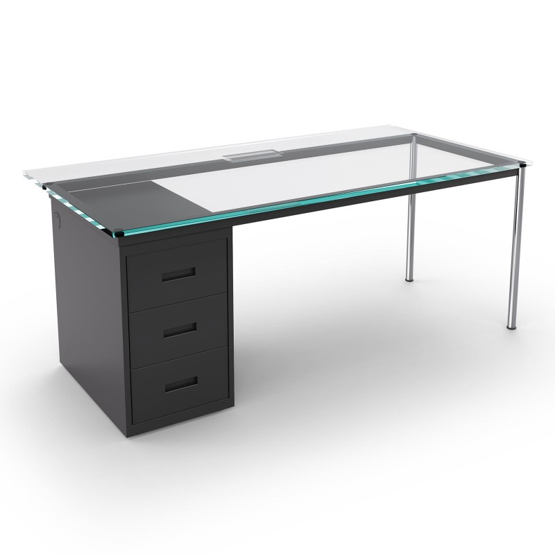 A project by Le Corbusier, Pierre Jeanneret and Charlotte Perriand, LC10 is the desk used in the office of the administrator of the newspaper La Semaine à Paris, from which it takes its name. The table was adapted to the daily needs of office work: Charlotte Perriand thus inserted a metal container on the side to store the files and extended the cantilevered glass plate to create a compartment for storing stationery material. Cassina has re-edited the desk preserving the original project and enriching it with a sheet metal chest of drawers, a technical compartment for the preparation of electrification and a USB port. The wiring is introduced with a lower cable entry access and exits laterally from the external side of the drawer unit.