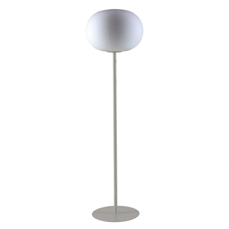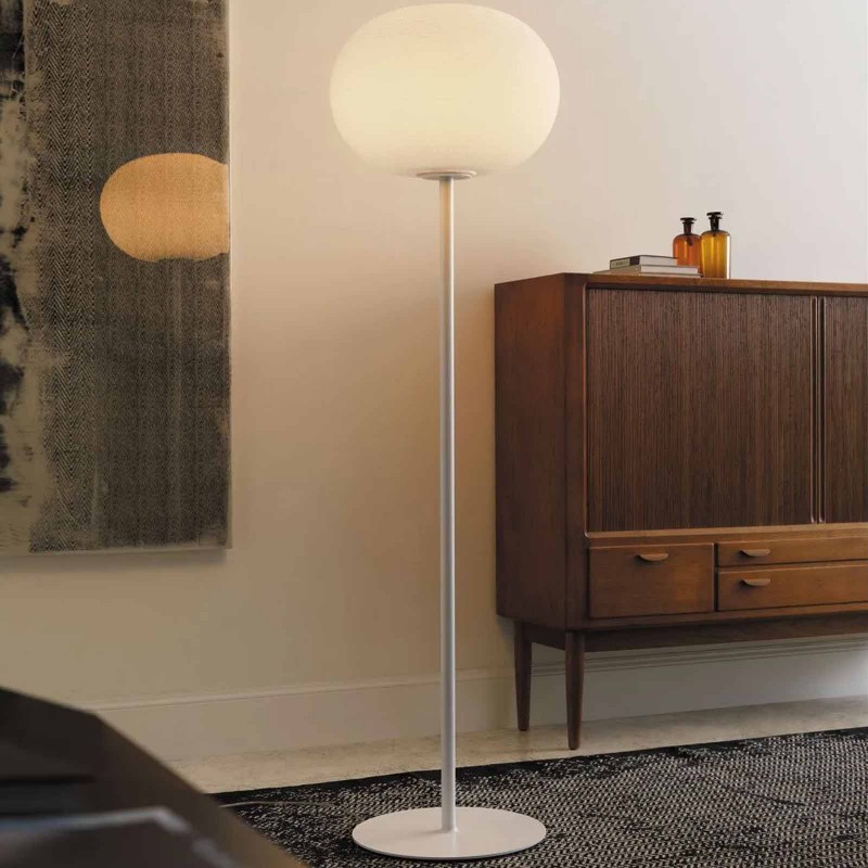 Bianca is a family of luminaires equipped with a fixed-mould blown cased glass diffuser with a milky white satin finish. The decoration on the diffuser surface features an orderly series of shallow delicate grooves etched into the white glass, yielding an effect resembling small footprints on fresh snow. Mouth blown, belt sanded and dipped in acid to obtain the distinctive 'silk effect' typical of fine glassware, Bianca diffusers are available in three different diameters to complete all thirteen types of luminaires belonging to the family. The largest diffuser has a 50 cm diameter and, owing to its dimensions and the amount of glass involved, continues to pose a considerable challenge even for the ablest of glassblowers trained in the fixed-mould blowing technique, which – according to the traditional Venetian production process – is performed without any external aids for turning and shaping the glass blob inside the mould, but relies solely on the glassblower's skill and lung capacity. Bianca is available in the following versions: table-top without stem, floor-standing with base and stem, pendant, wall-mounted and ceiling mounted. The matt white coating applied to the various metal supports evokes the name and color of the diffuser. The Small- and Medium-sized versions (with 16 cm and 30 cm diameterrespectively)  mount a dimmable Led board, while the Large-sized version (50 cm diameter) features an E27 lamp holder capable of housing various types of light sources. Bianca produces a very warm, diffuse and enveloping light emission in the surrounding environment.