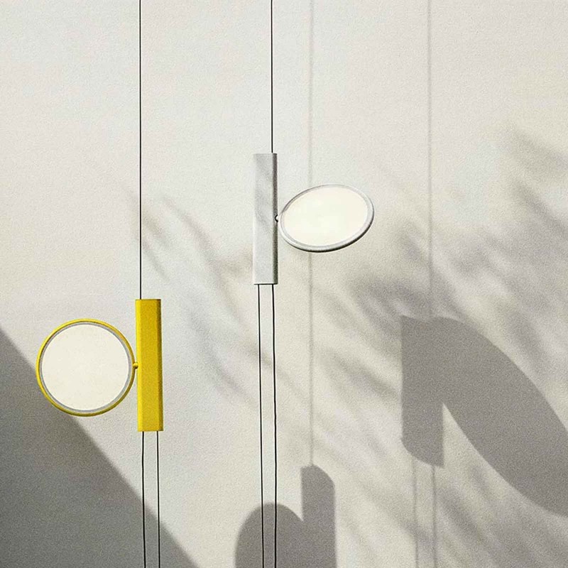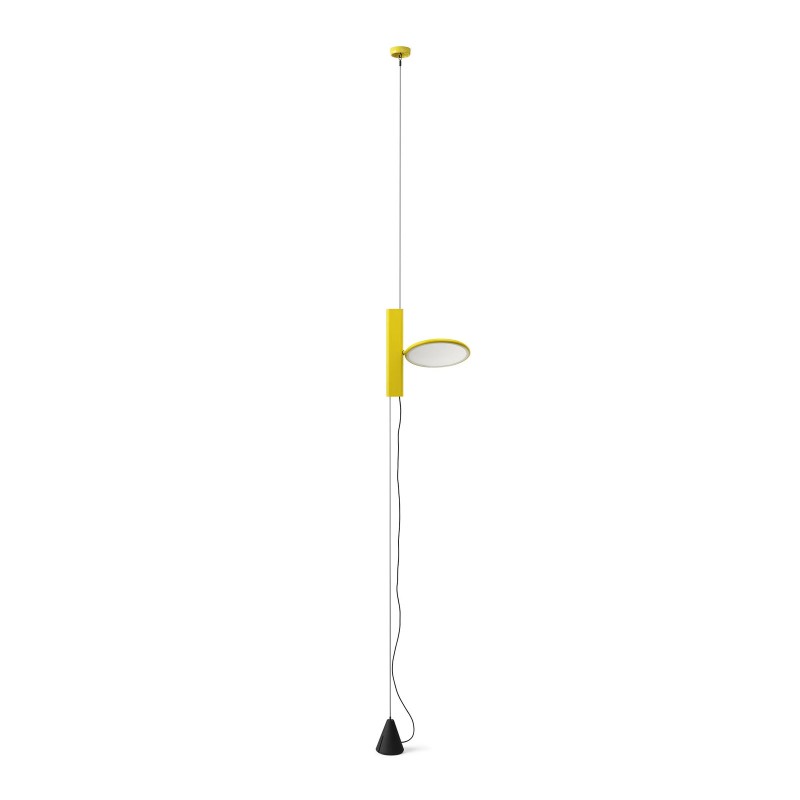 Lamp providing direct light. Head in gloss varnished or chromed die-cast aluminium. Body in injection-stamped PA66+30%FV with cover in gloss varnished or chromed die-cast aluminium. Directionable head. The light fitting can be moved vertically by running the internal structure of the body on a steel cable tensioned between the ceiling and the floor (useful length 4000mm). Dimmable switch with Soft Touch technology. Adaptor on plug connector with interchangeable plugs.