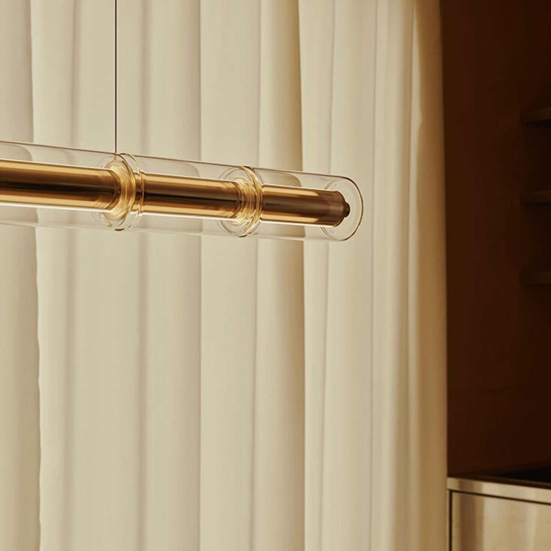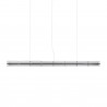 Diffused light pendant lamp. Horizontal body in polished extruded aluminum with two LED strips for upward and downward light emission. The integrated touch dimmer allows for independent control of the light output. The body is enclosed within a series of borosilicate glass cylinders separated by traditional spacers. It can be installed in multiple parallel rows.
