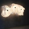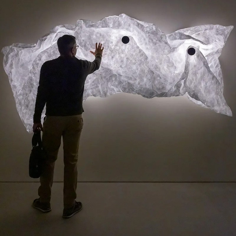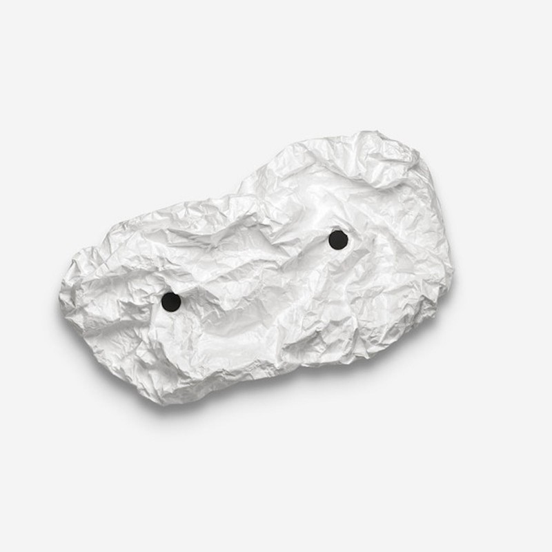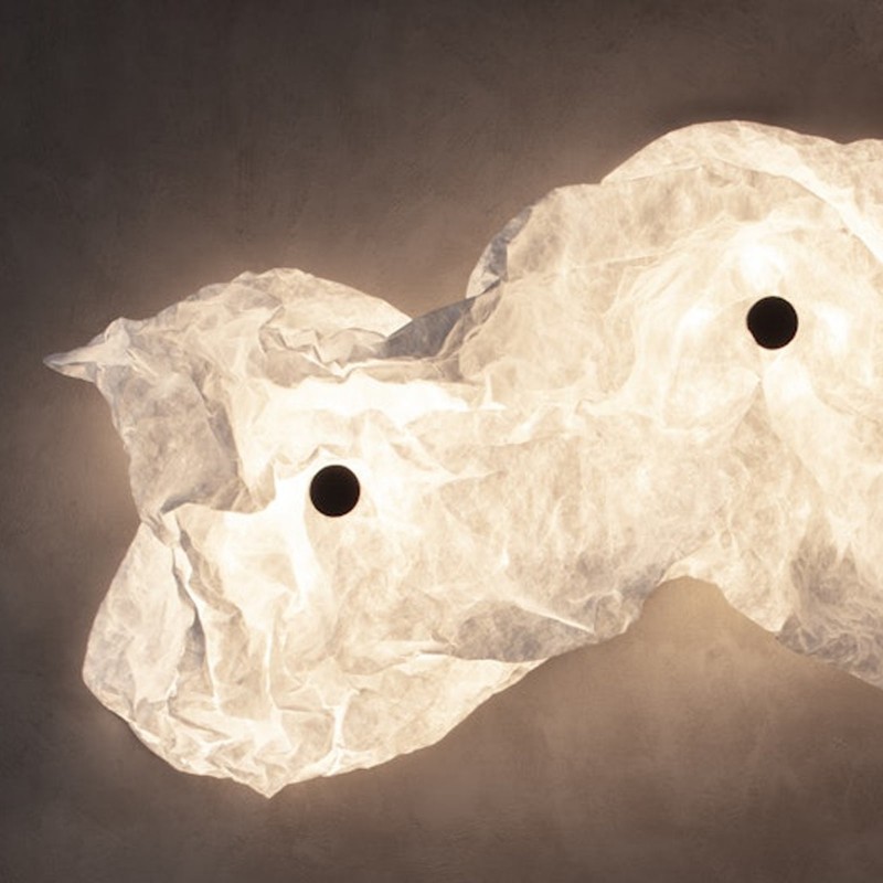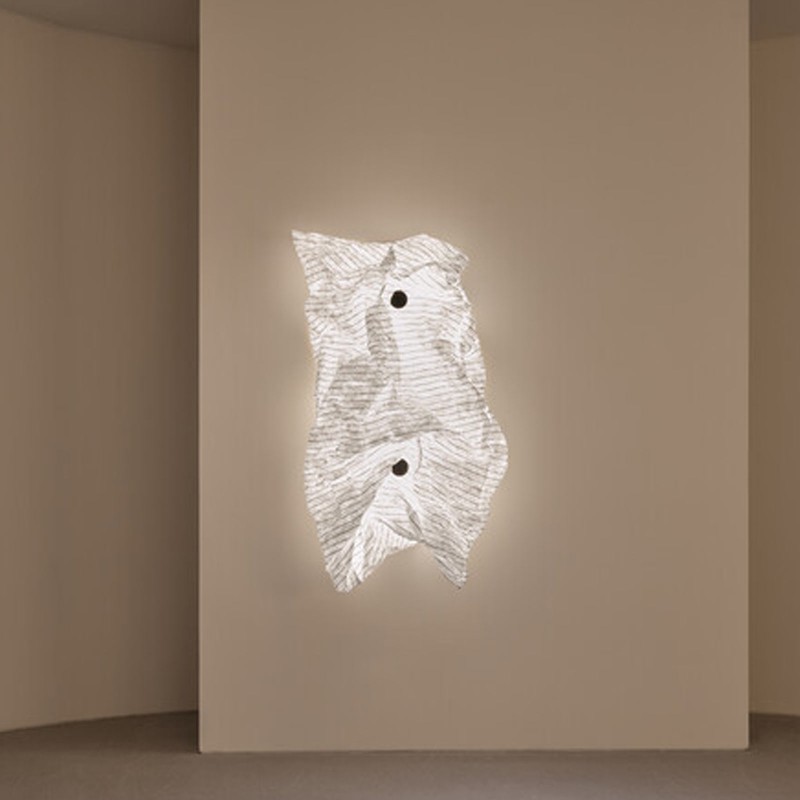 Maap by Flos is a wall lamp with a strong visual presence, consisting of four LED light sources and a cross-shaped support that magnetically secures the diffuser via Dots. Available in three sizes, it can exceed 3 meters in height, transforming the wall into a field of light. Hand-crinkled, the diffuser creates ever-changing organic shapes. The light spreads from the entire surface, enveloping and uniform.