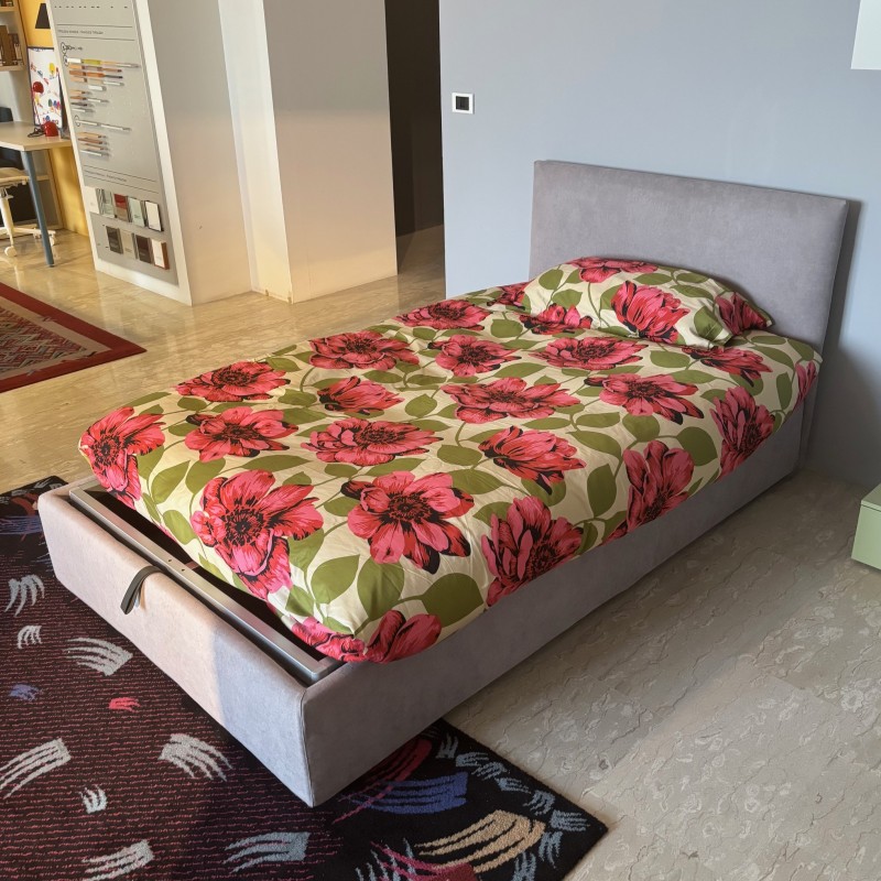 Samoa's Plain full-size bed at outlet price on display in our Sassoferrato showroom has upholstered headboard and bed frame, storage with front pivot riser and is offered as follows: