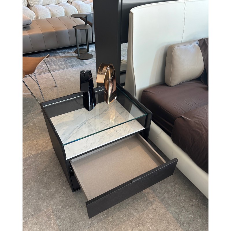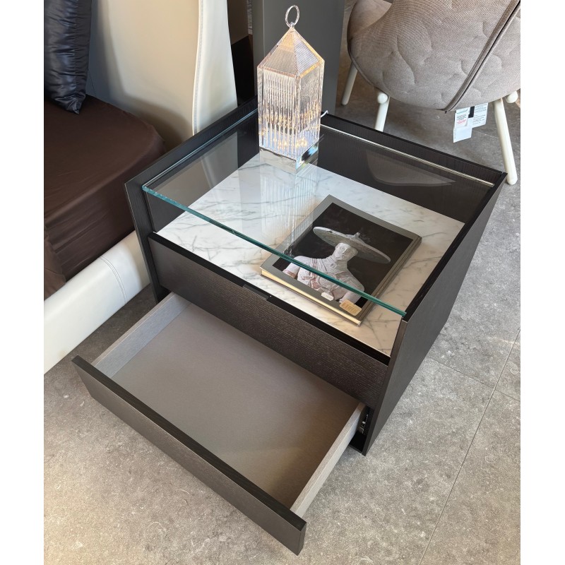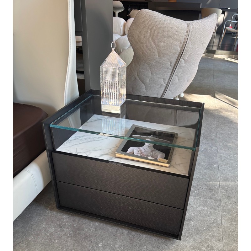 The Cabaret nightstand by Sangiacomo is a modern storage unit for the bedroom area that features a “recessed” top in the tray-effect structure, as the name suggests. In this version at outlet price for exhibition renewal, Cabaret is offered in the following configuration: