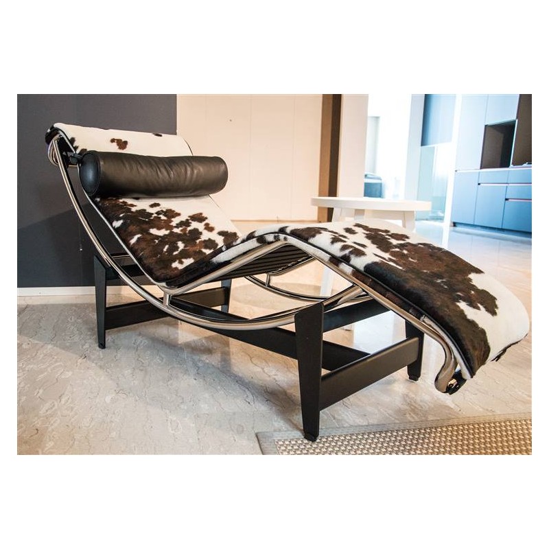 Chaise longue con materassino in pelle con pelo pezzato bianco, nero e marrone; basamento nero. Dimensioni: 160 x 56,4 cm.