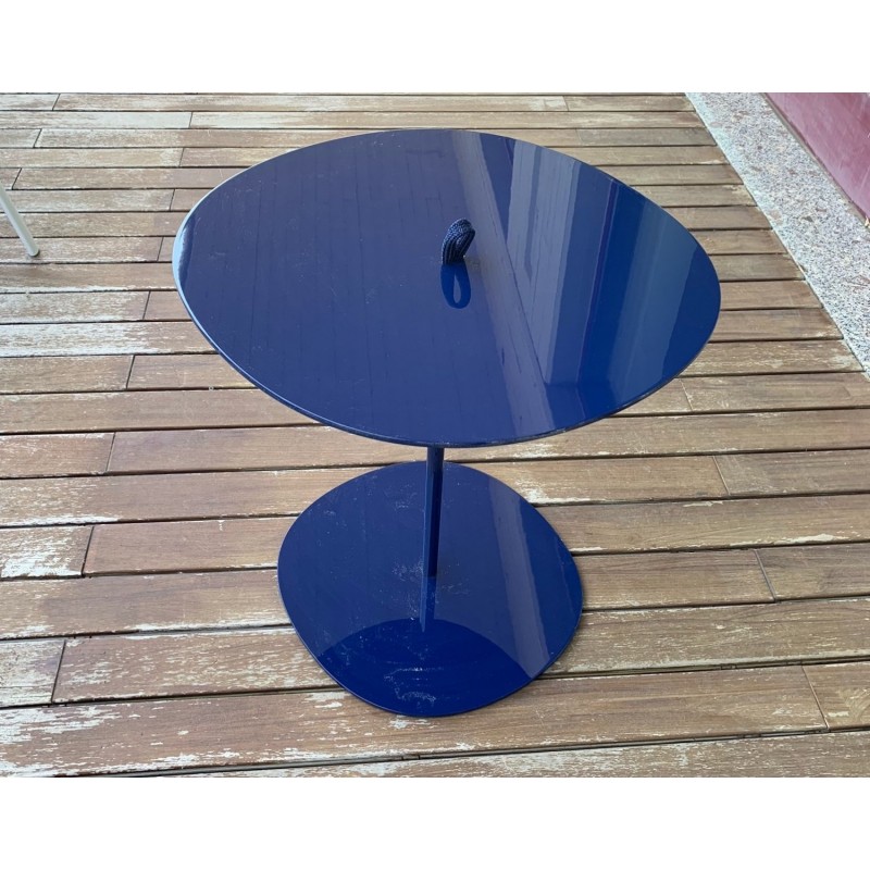 Paola Lenti's Strap side table is a blue gloss-painted aluminum furniture piece ideal for completing an outdoor area or living room. It includes a handle in the center of the Rope top that matches the color of the frame.