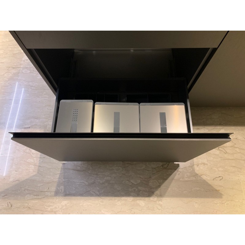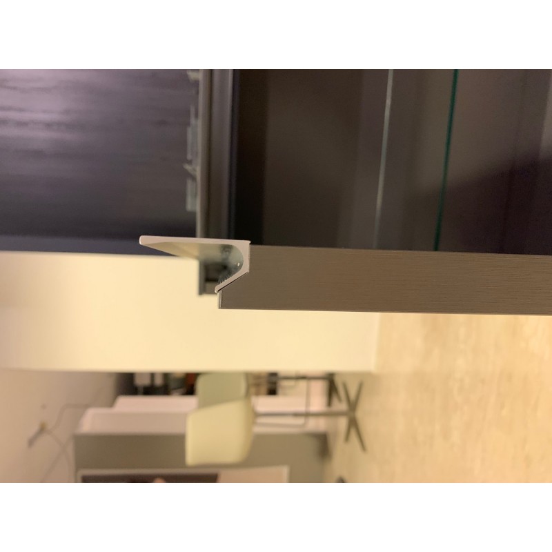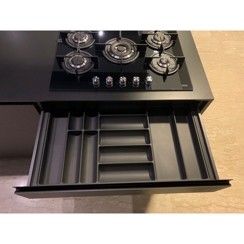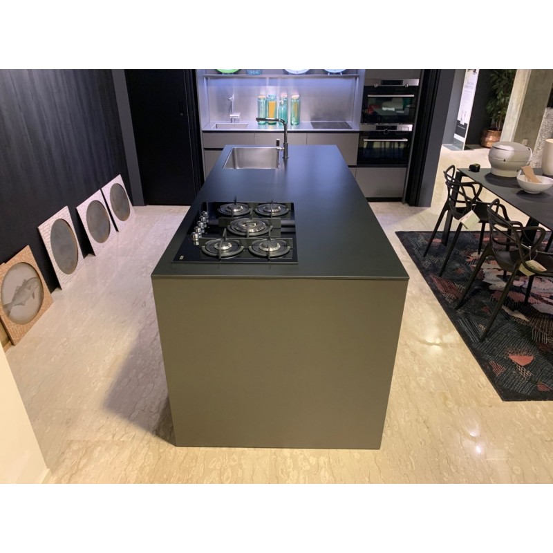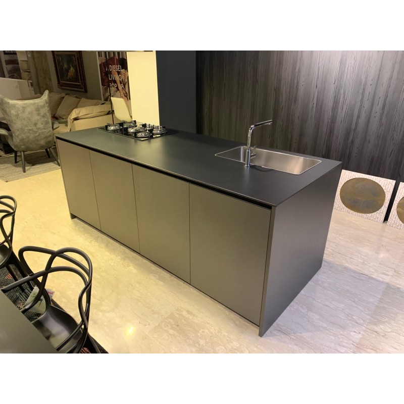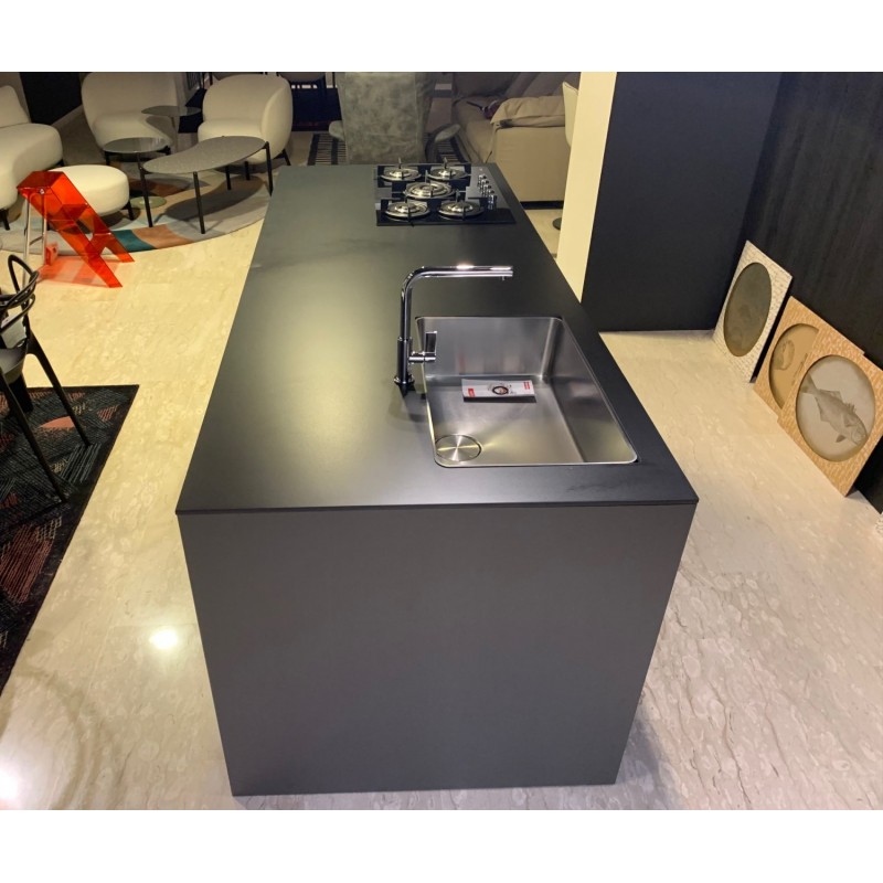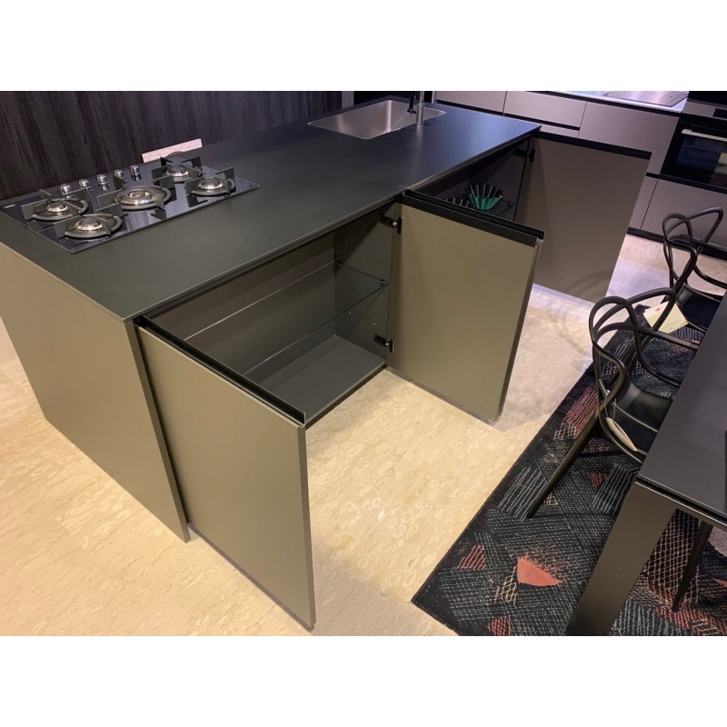 Cucina ad Isola modello Tratto Linea di Meson's, in offerta per rinnovo expo, con fianchi e frontali in finitura laminato Mica Lapis, gole e zoccoli finitura alluminio Brown, piano in gres porcellanato by Gres Project finitura nero naturale.