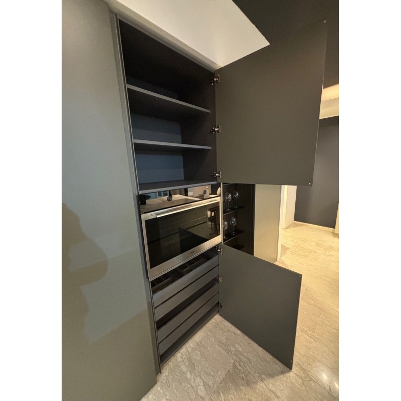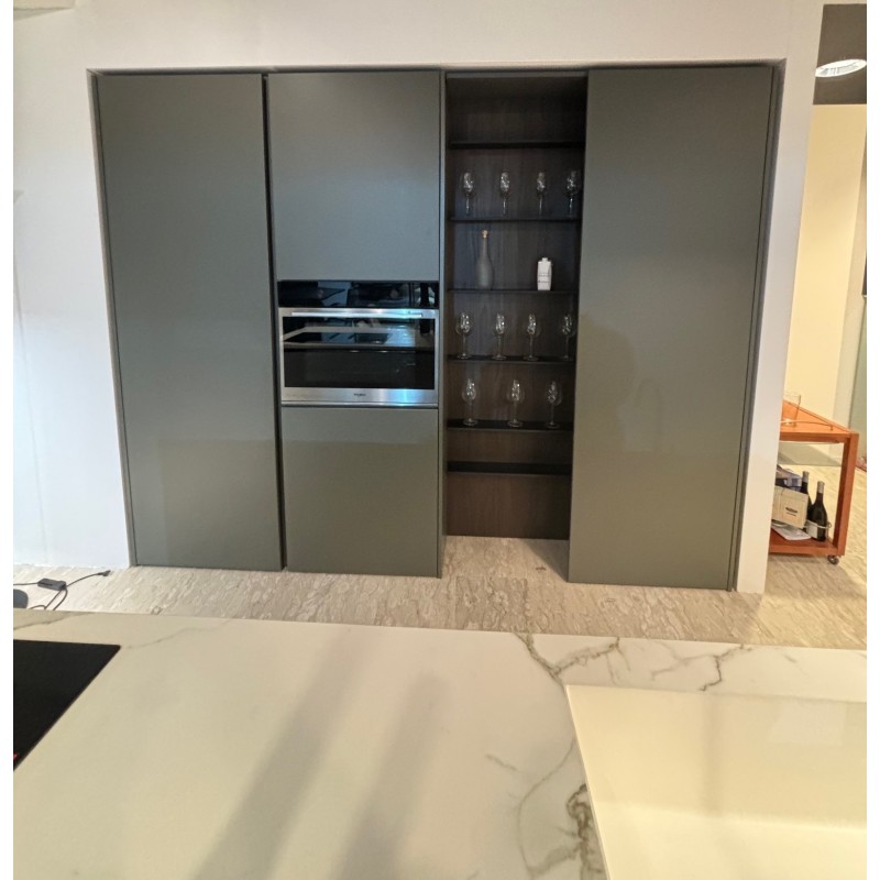 Forma's kitchen with island offered in the outlet features moss green laminate columns and a dramatic niche in walnut-colored wood, working island with sink and cooktop and table.