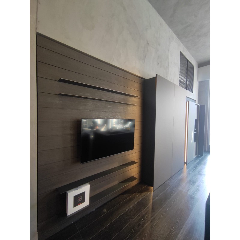 The MH6 Super Matt kitchen by Modulnova available in stock at outlet price for expo renovation in our Ancona showroom is a composition with a central island, columns and an area dedicated to the living corner equipped with boiserie, shelves and TV housing.
