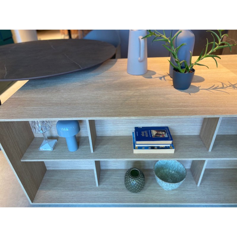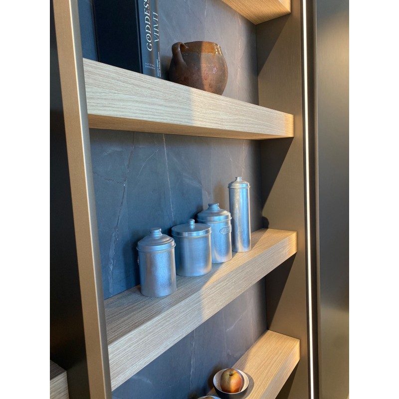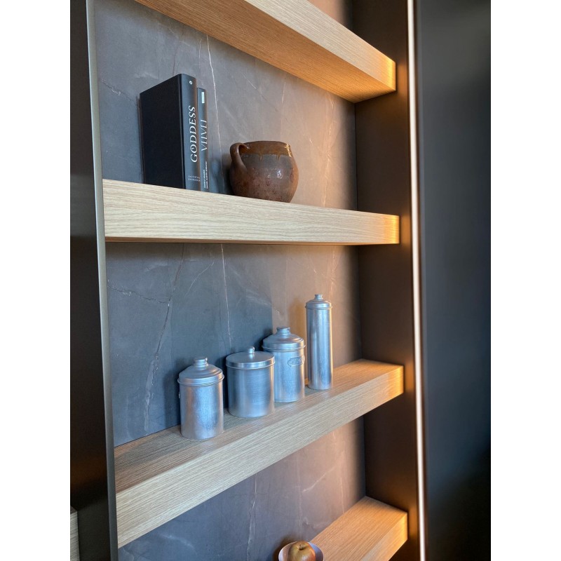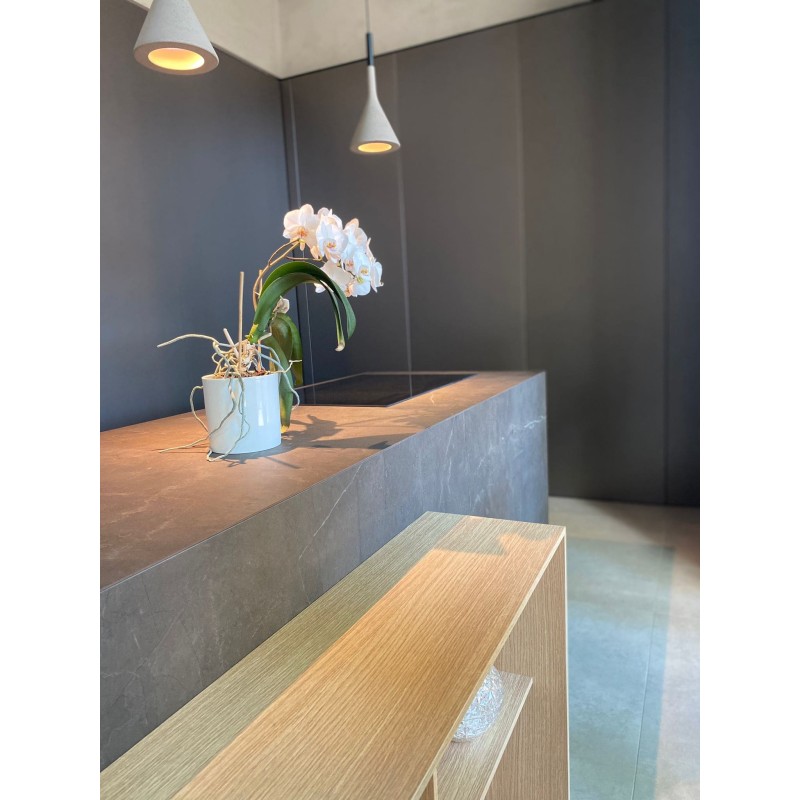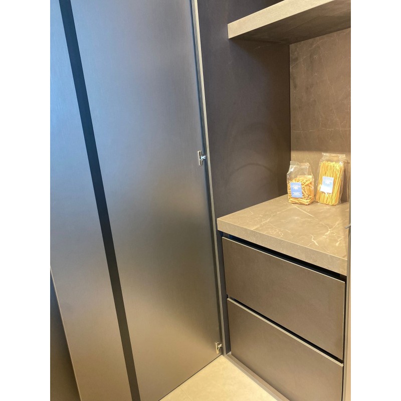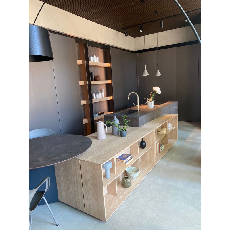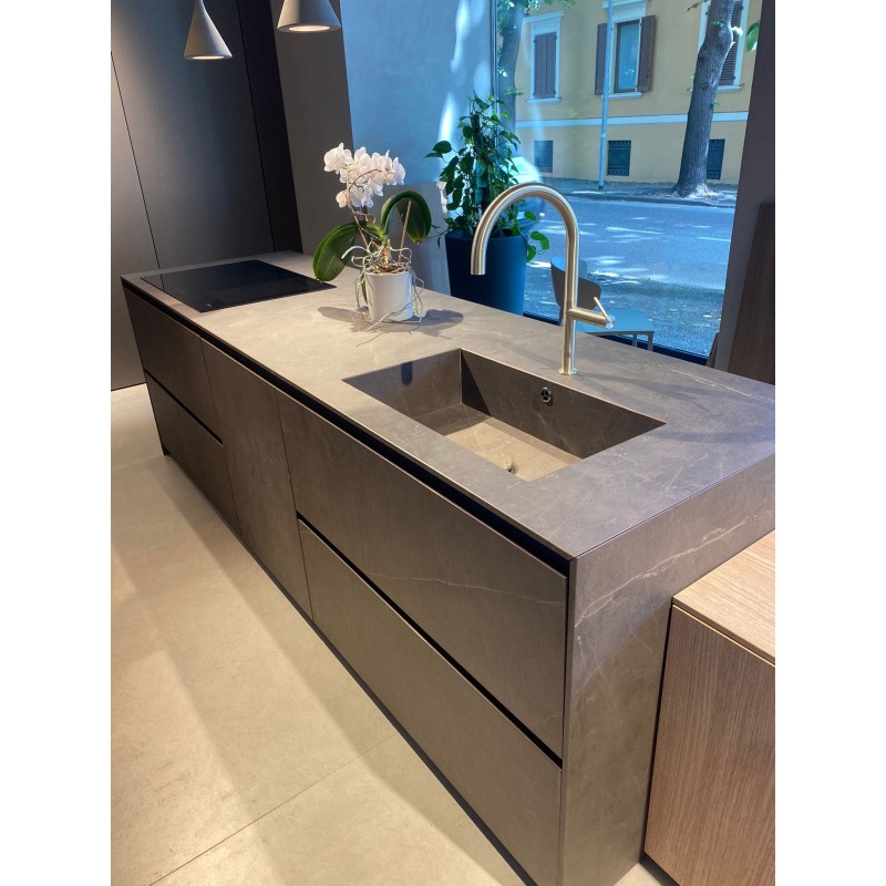 In this composition at outlet price for exhibition renewal, the kitchen is proposed as follows: The island is monolithic and entirely made of stoneware, the doors in the same material are coupled with a honeycomb aluminum panel to give lightness and allow effortless opening.