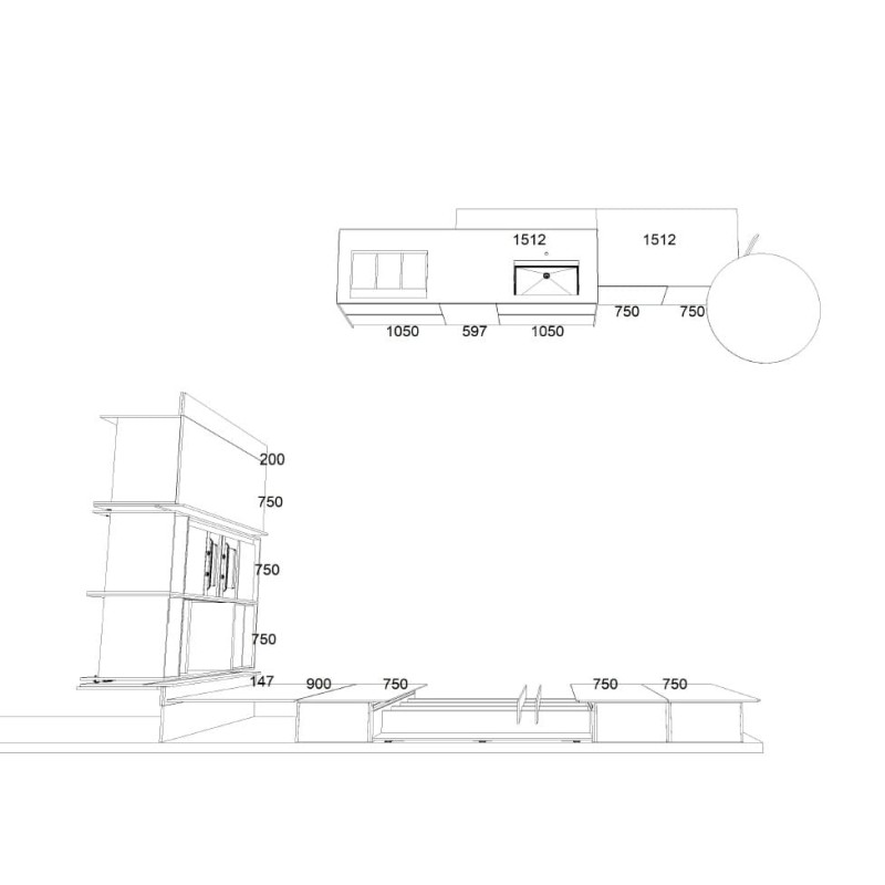 Island base with storage compartments L 303 cm with 30 cm protrusion from the island