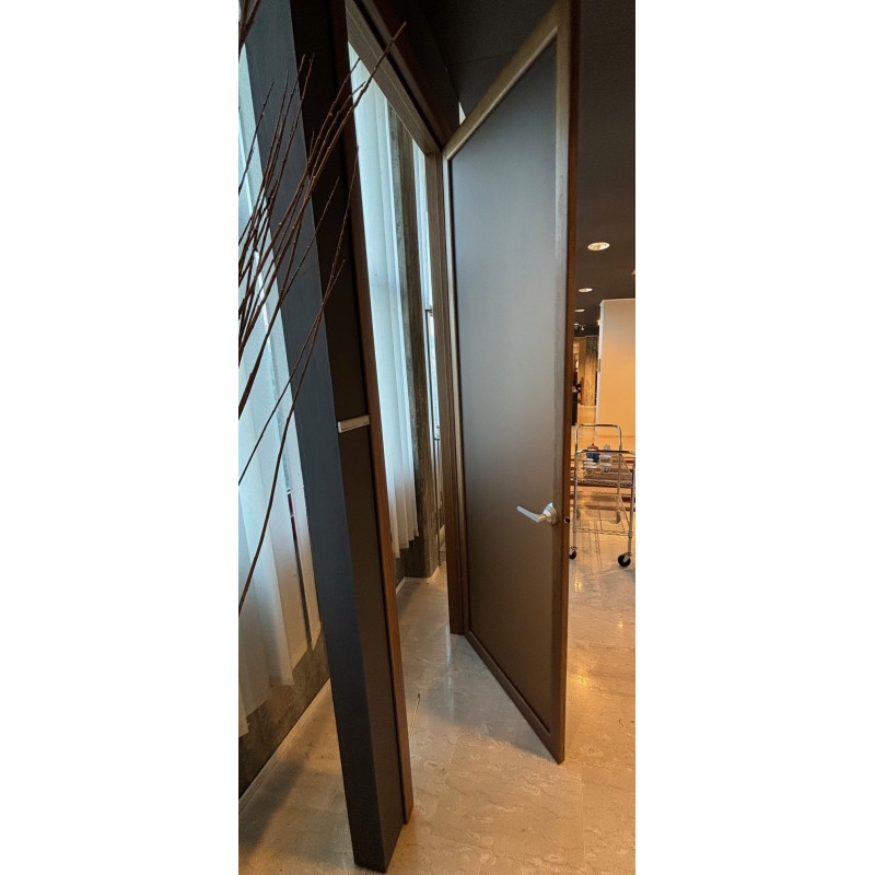 Quadrante by Rimadesio design Giuseppe Bavuso is a minimalist hinged door featuring a walnut frame and transparent opaque glass door front with walnut profiles. Available in stock with outlet price for expo renewal: