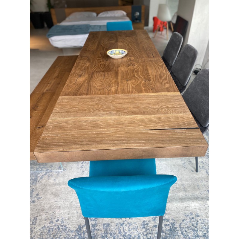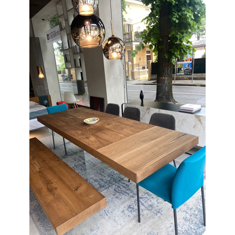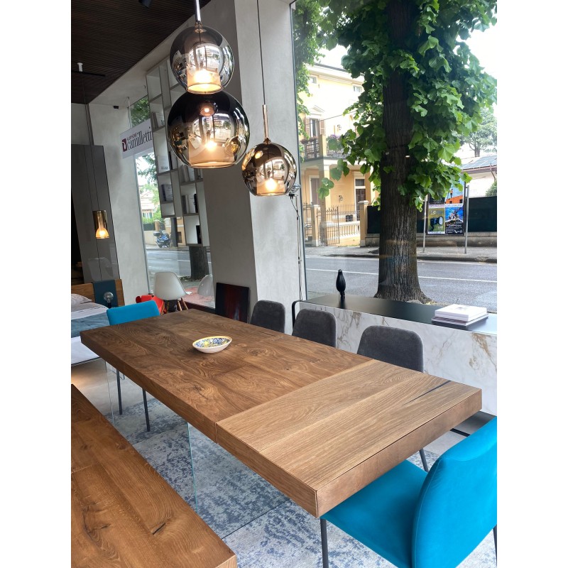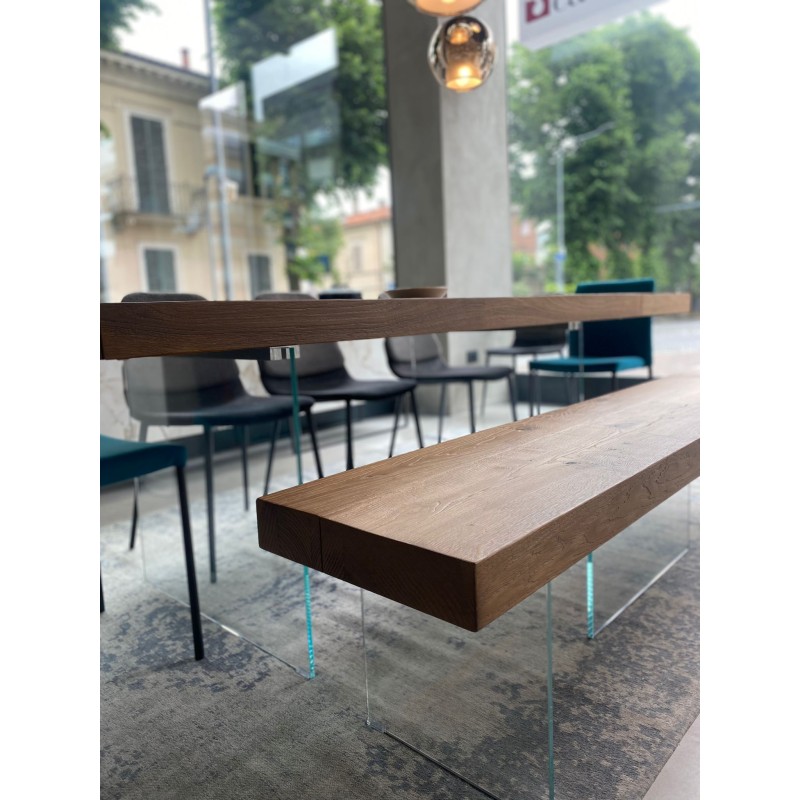 The Air Wildwood table by Lago is characterized by the lightness of the tempered glass legs and the material consistency of the oak wood top.