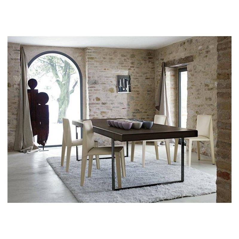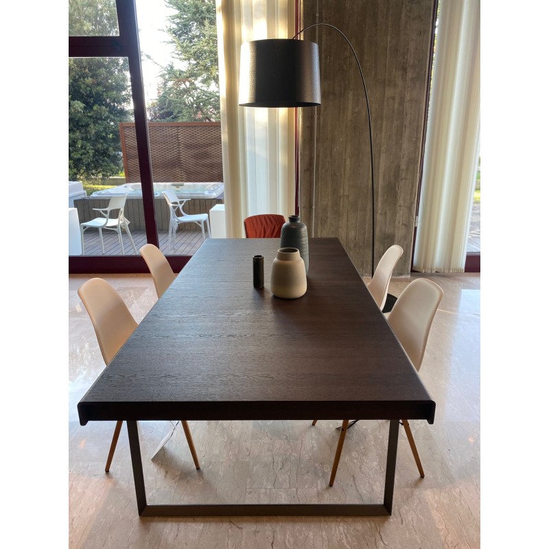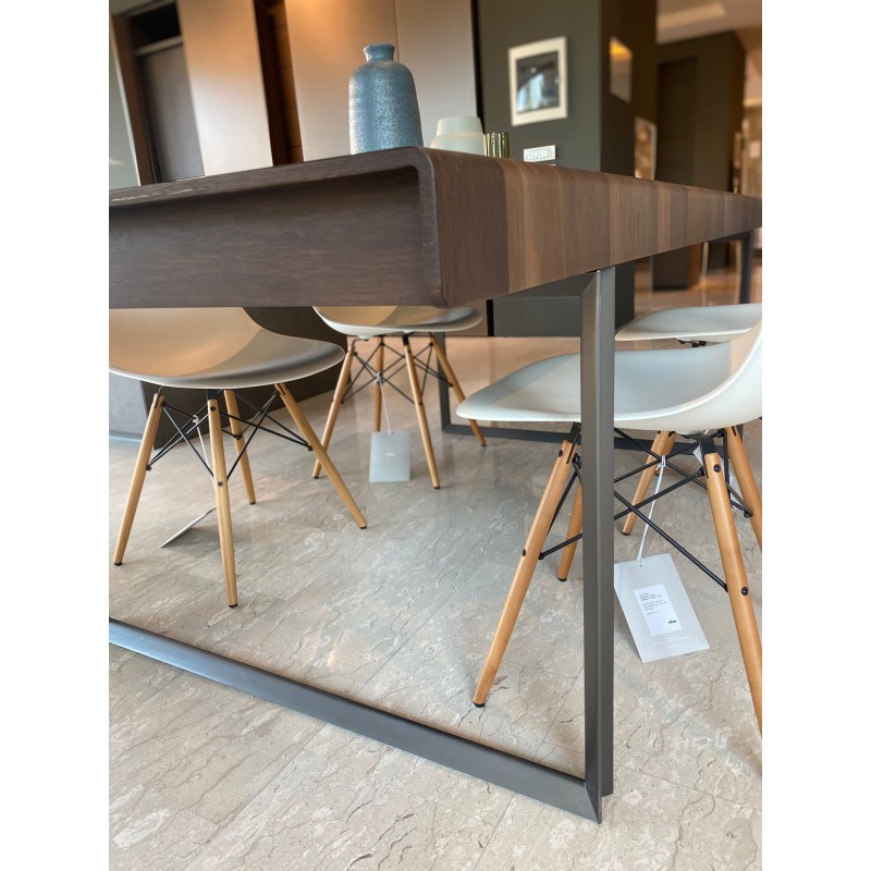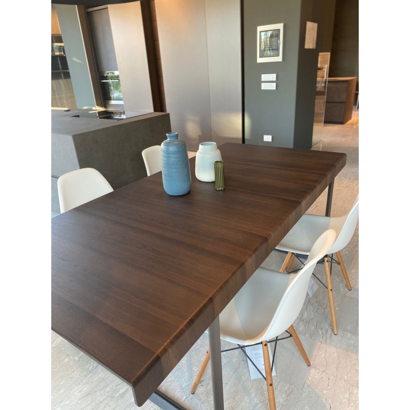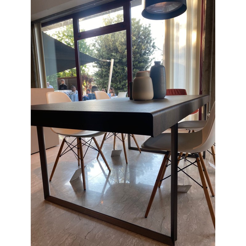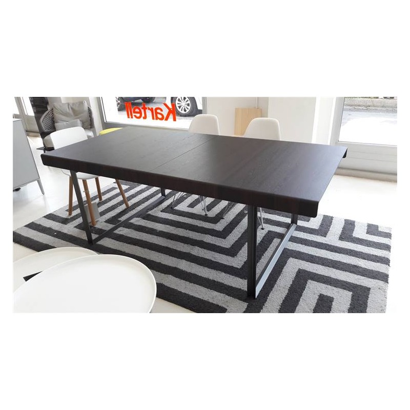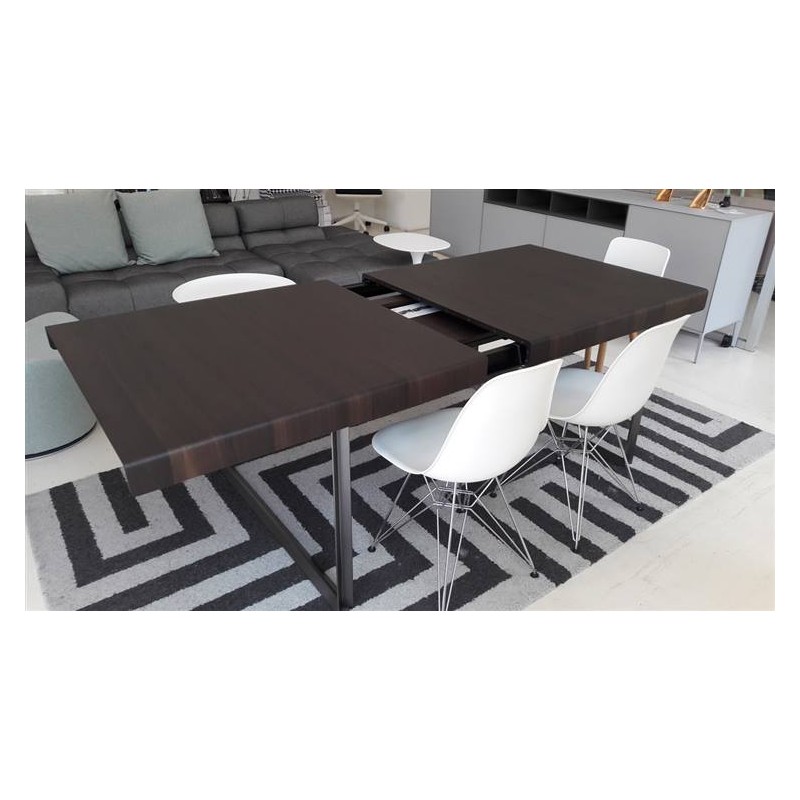 Tavolo Athos '12 di B&B Italia largo 100 cm, allungabile da 205 a 270cm. Il piano è costituito da pannello in particelle di legno con parti in massello. Il piano è impiallacciato in rovere fumigato. La struttura è costituita da trafilati d'acciaio verniciato nickel bronzato. Spedizione inclusa.