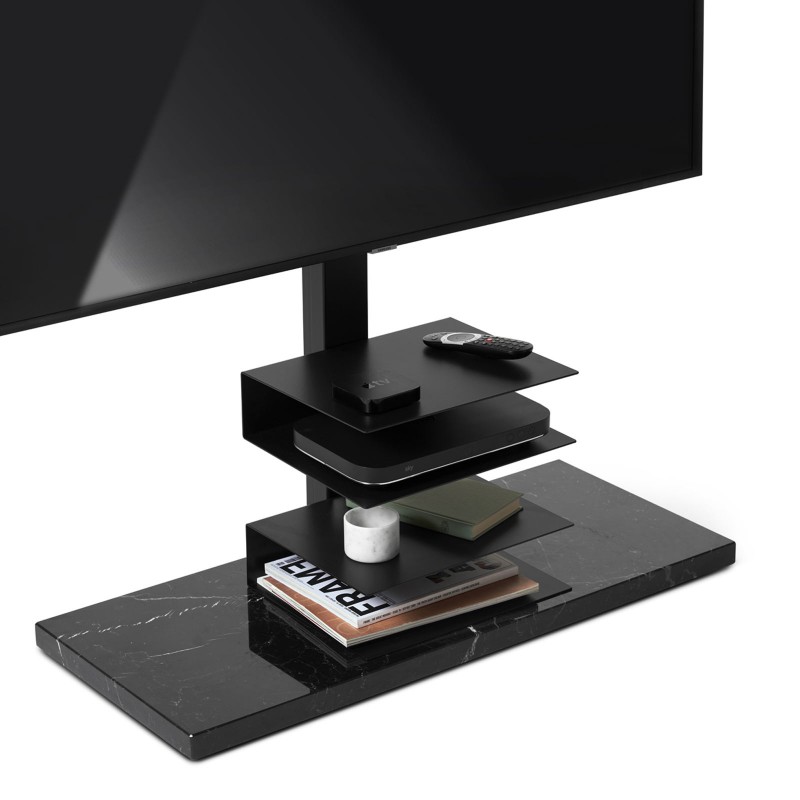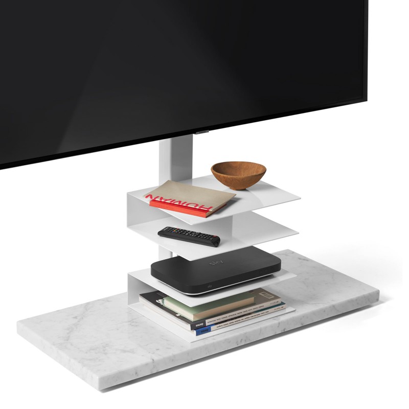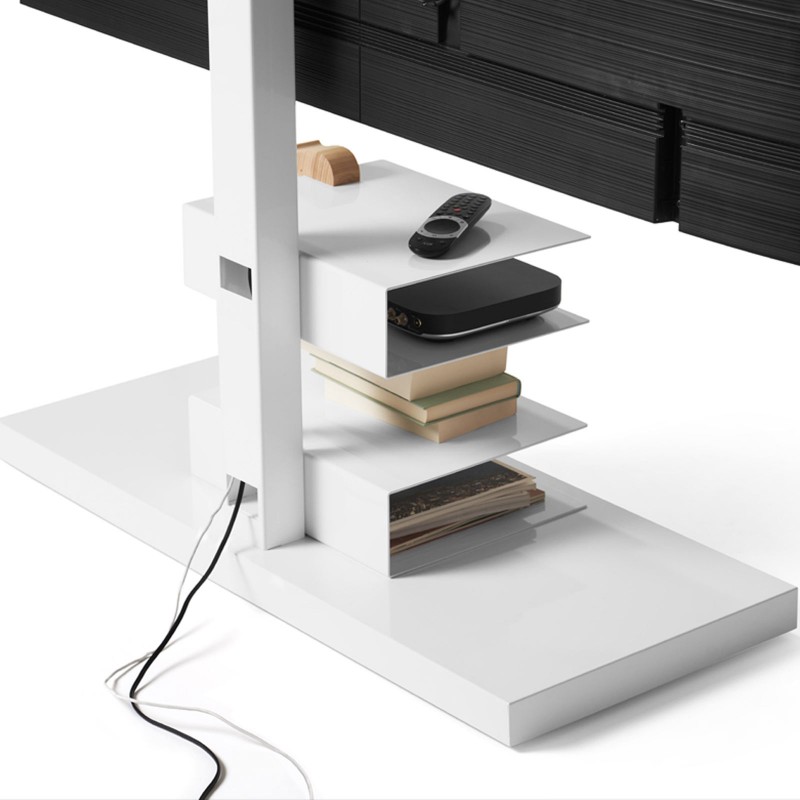 Ptolomeo TV Smart by Opinion Ciatti is the TV cabinet born from the Ptolomeo collection. Support for TV from 43 to 82 inches, Ptolomeo TV Smart provides a cable collection column with steel shelves to contain the devices and support with TV adapter. Movable, it is equipped with pivoting wheels to adapt to different spaces and needs. The available finishes are: glossy white or matt black, or in the sophisticated glossy white RAL 9003 mix structure with base in white Carrara marble or matt black with base in glossy black Marquina marble.