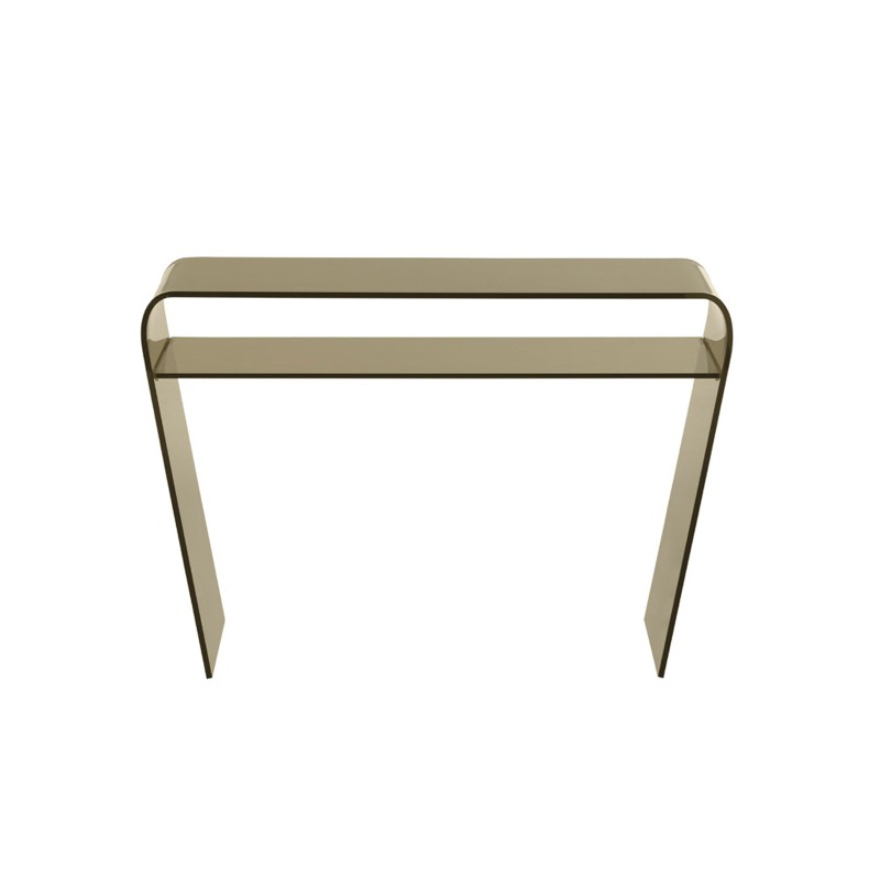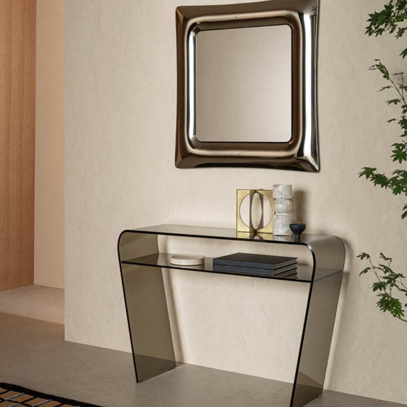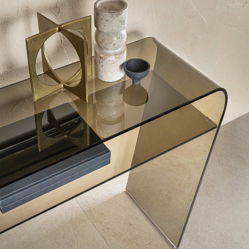 The Saphiria console by Riflessi, which has now become a signature piece of the brand, for 2024 is offered in a new finish that makes it even more elegant and precious: it is bronzed transparent crystal, capable of warming the environment and adapting to more natural tones. Extraordinarily simple and sophisticated at the same time, Saphiria is distinguished by a curved line that performs the function of base and top, enriched by a convenient integrated shelf under the top.