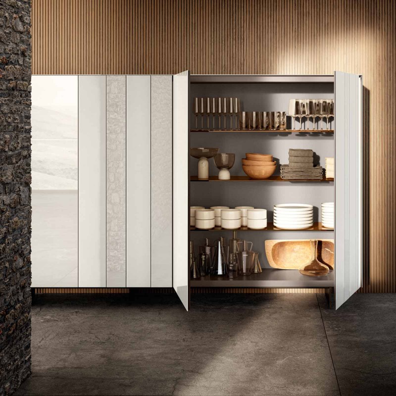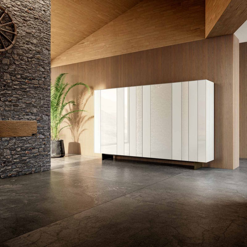 A sideboard enhanced by the aesthetic rhythm of the vertical bands in XGlass glass. This is N.O.W., the new collection of suspended and free-standing containers by Lago presented at Milan Design Week 2021. Scenographic and containing at the same time, the N.O.W. has patented opening and internal lighting included. The decorative motif is also on the side parts of the sideboard.