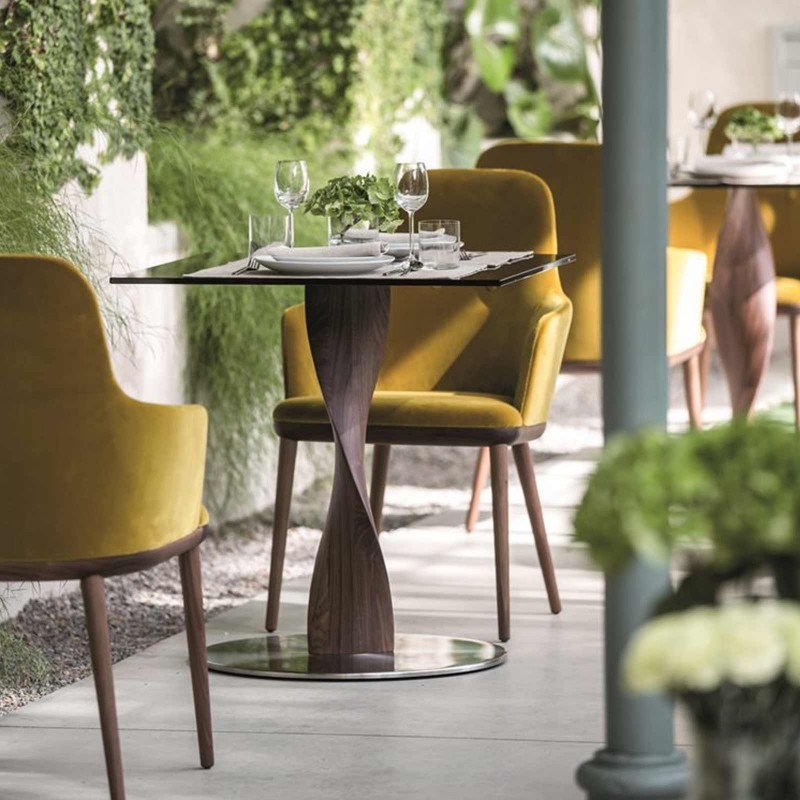 Spin by Porada is an elegant round table characterized by a slender spiral-shaped base in solid canaletta walnut or ash mounted on a metal ring and tempered glass top (12 mm thick).