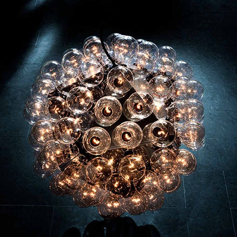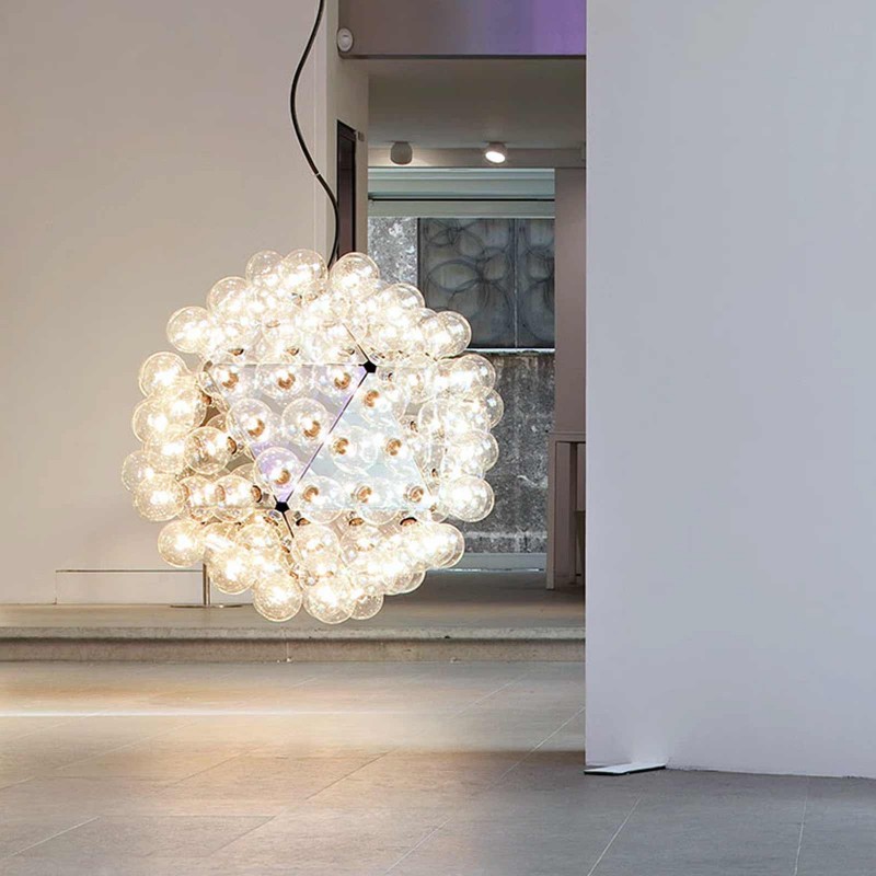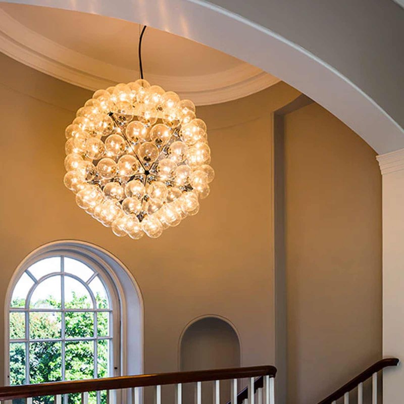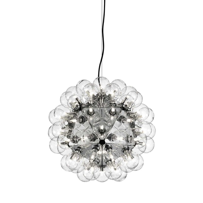 The Taraxacum 88 chandelier by Flos is a project by Achille Castiglioni that is inspired by the Tarassaco Officinale plant, a spherical flower known as a shower head due to the petals that fly at the first gust of wind. A luminous object resolved through equilateral triangles in polished chromed aluminum, designed to house a multitude of light bulbs. Taraxacum is available in various versions, here proposed in the smallest size.