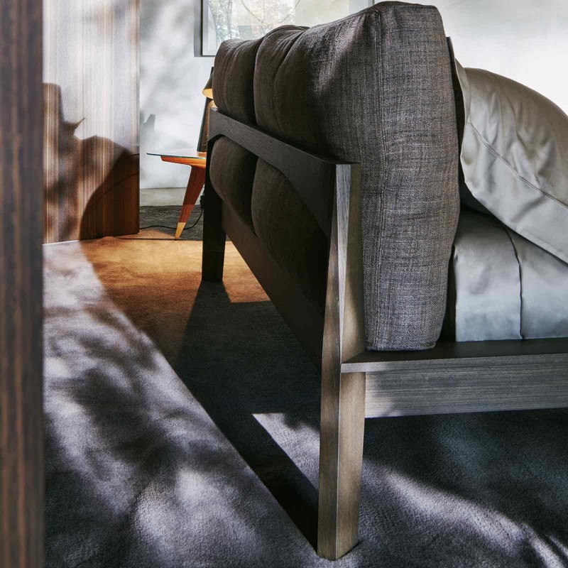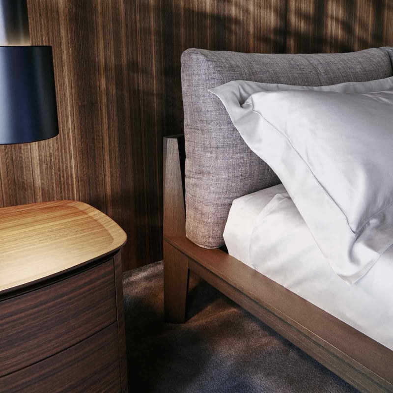 The Wish bed by Molteni & C design Rodolfo Dordoni is a piece of furniture for the bedroom with a classic appeal. The wooden structure is expertly worked with the brand's artisanal and industrial techniques. The solidity of the natural material is contrasted by two soft cushions to be covered in fabric or leather. Gray oak, black oak, light elm or dark elm (parts in solid stained oak) are the available finishes. The eucalyptus version is made of solid and stained veneer.