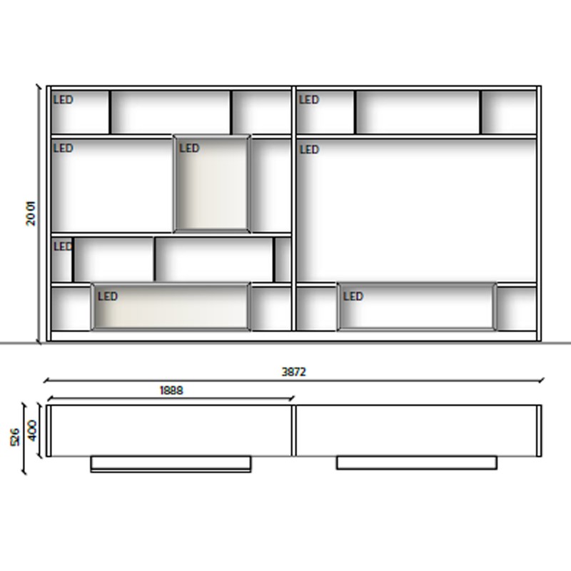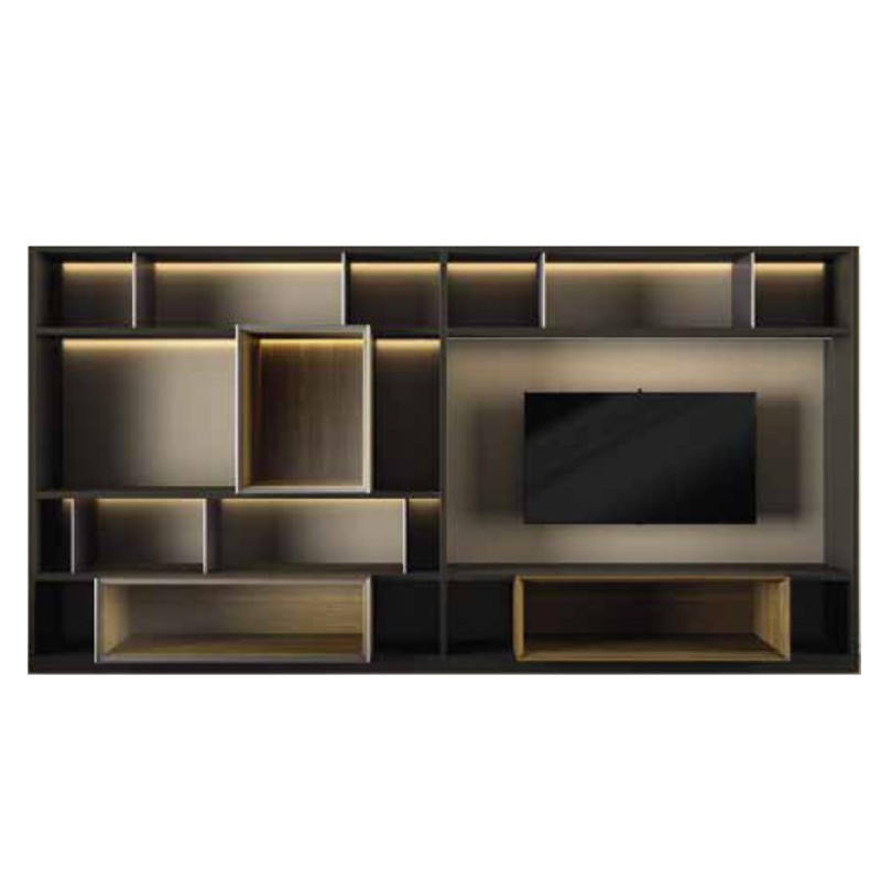Dans cette composition fixe, 505 est proposé avec le compartiment pour loger la télévision, les compartiments jour et les conteneurs avec portes vitrées.