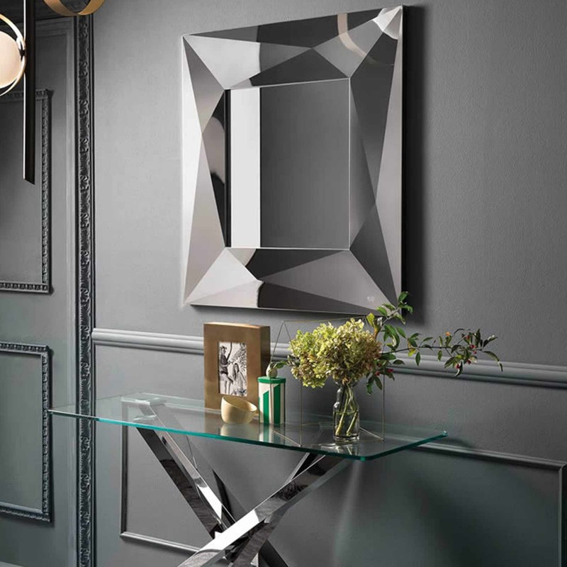 Diamond est un miroir raffiné avec cadre faceté en inox brossé. Simple et épuré, ce miroir fera de votre mur une oeuvre d’art. Diamond est disponible en deux dimensions et avec un cadre en inox brossé, en inox laqué blanc ou en titane.