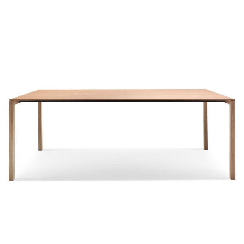 Naan est une table au design épuré signée Piero Lissoni pour Cassina, où légèreté visuelle et solidité structurelle se rencontrent dans un équilibre parfait. Le plateau ultrafin (seulement 10 mm) est disponible en plusieurs finitions raffinées, dont le chêne fumé, traité thermiquement pour garantir résistance à l'humidité, dureté et une coloration profonde et durable qui met en valeur les veines naturelles du bois.